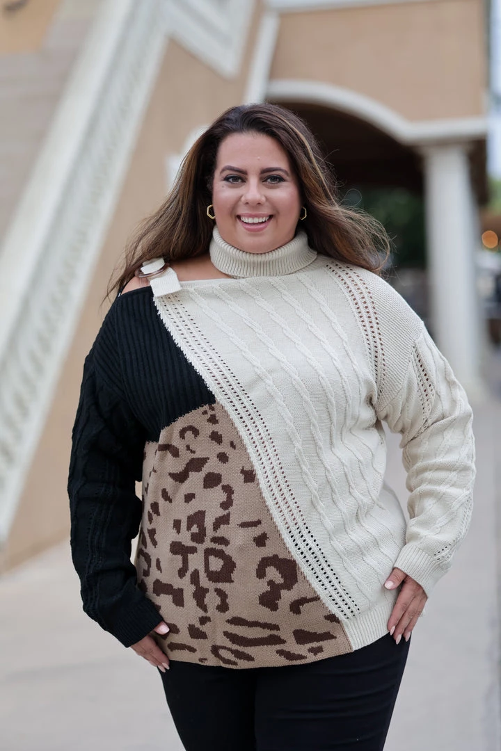 Let your wild side shine in this amazing cable knit colorblock turtleneck. Featuring a relaxed fit, long sleeves and turtleneck shoulder cut out, this sweater will be the perfect unique addition to your wardrobe.Β