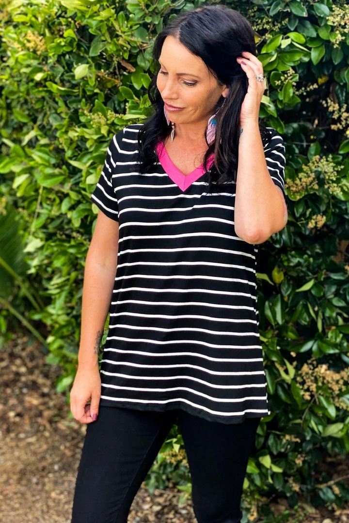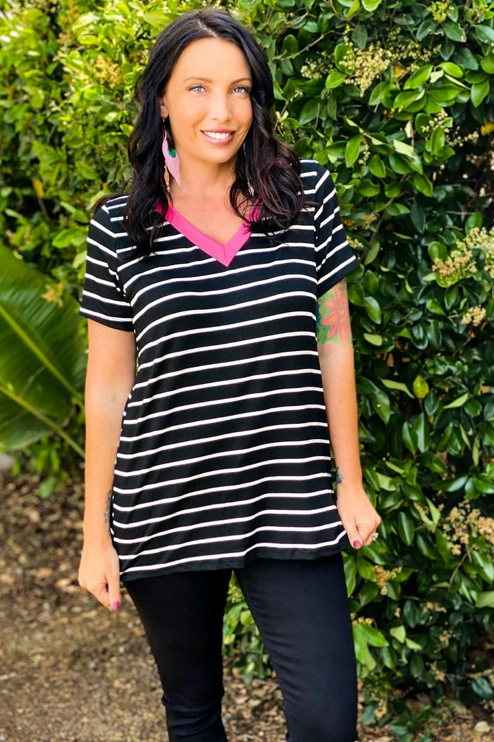 The love for this top is unreal. Not only are black and white stripes a classic look, but the touch of pink on the v-neck collar really makes this top pop!Β