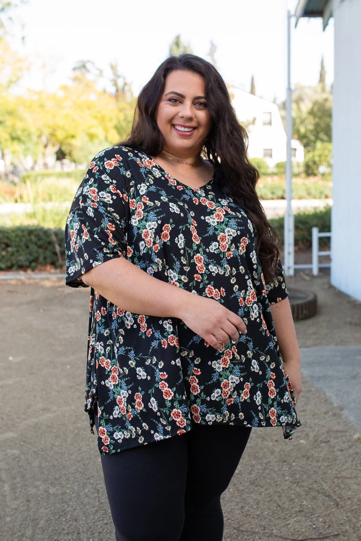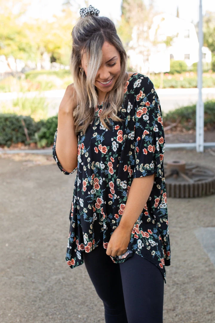 Spring showers bring May flowers and this gorgeous short sleeve top is as beautiful as those Spring blossoms. With a relaxed fit, this top features short sleeves, a v-neck and an asymmetrical sharkbite hem.Β
