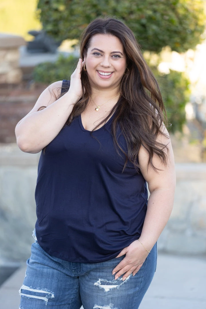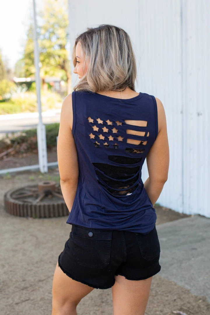 This tank is perfect for those patriotic days, especially because it’s so hot out. Pair this top with your favorite bralette for a complete look. Made from a soft jersey knit, this top has the most amazing laser cut flag on the back and also features a v-neck and relaxed fit.Β