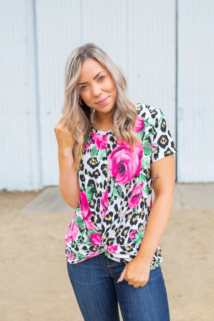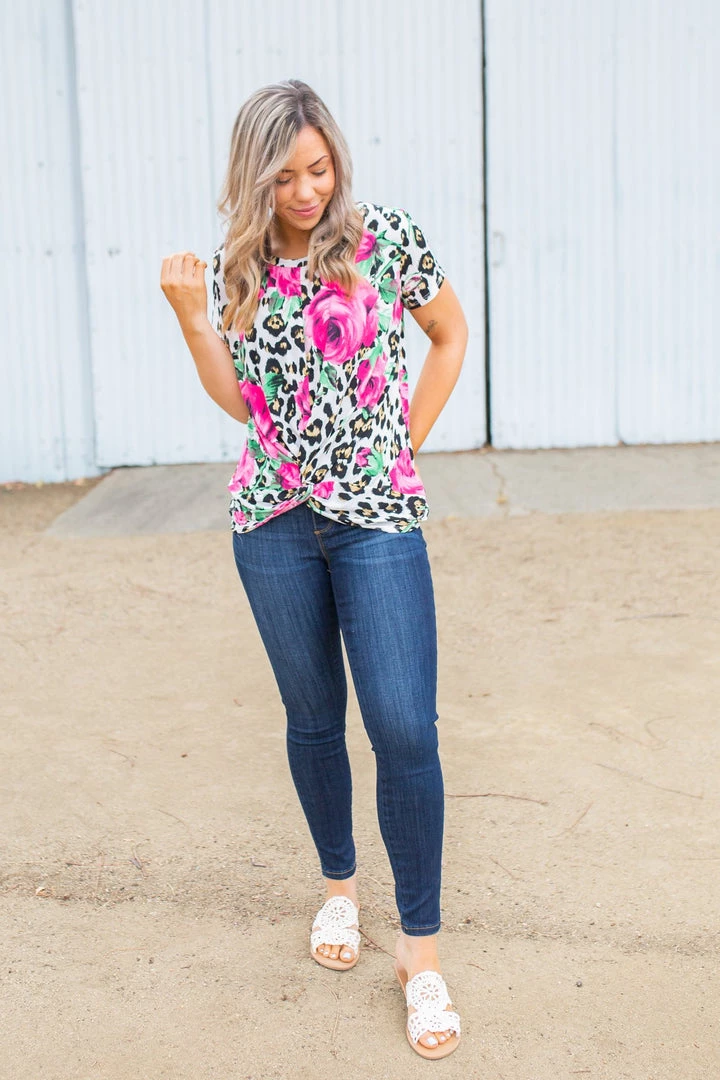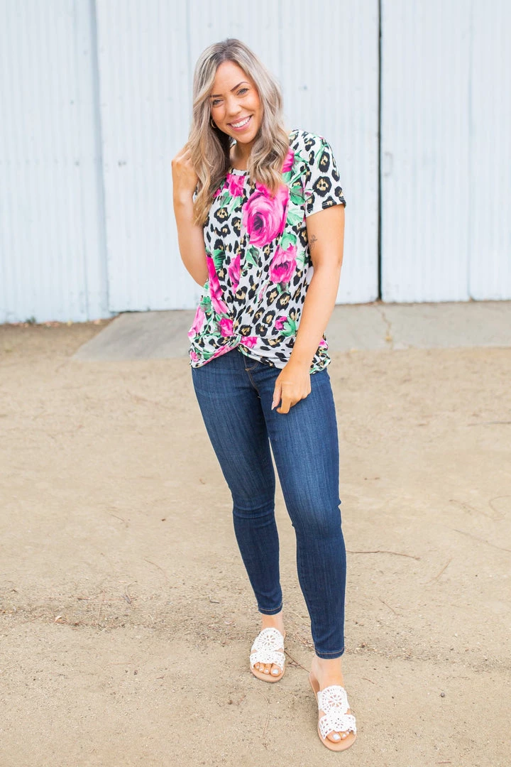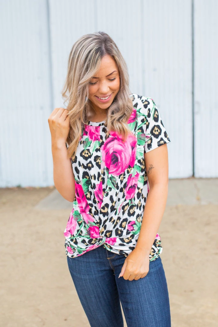 The print in this short sleeve twist top is truly enchanting. Made from a lightweight fabric, this top features short dolman sleeves, a round neckline and front twist detail.Β Β Β Β