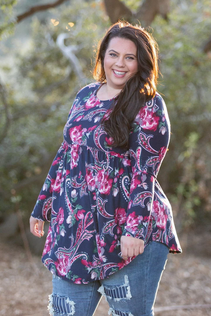 OMG, this long sleeve babydoll top is absolute perfection. The magenta paisley and florals print really pops against the dark navy background. This top has amazing stretch and is made from the most buttery soft baby suede. Featuring a round neckline and rounded, this top will pair well with just about anything.Β Β Β