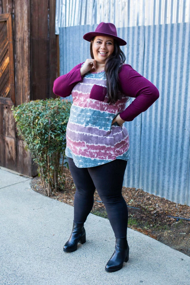 This long sleeve top will not only keep you warm, but it’s oh so stylish. We love the waffle knit sleeves and contrasting front pocket. Featuring a round neck and curved hem bottom, this top will be so easy to dress up or down.