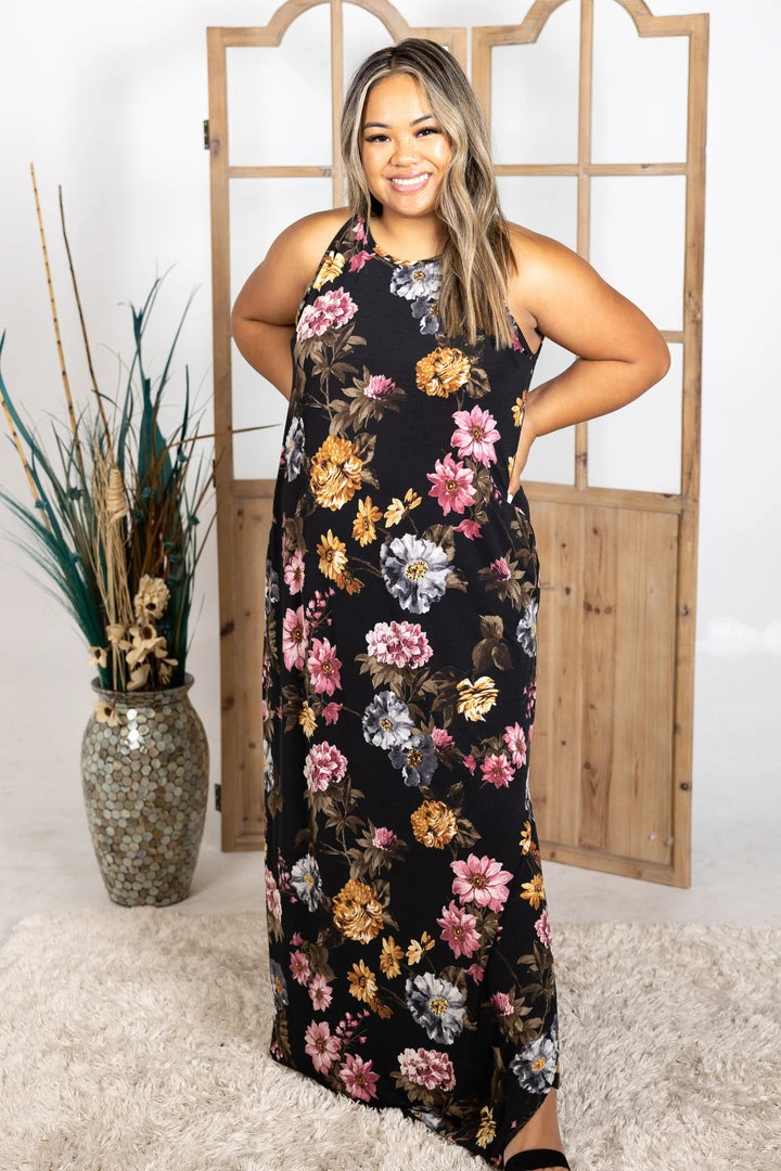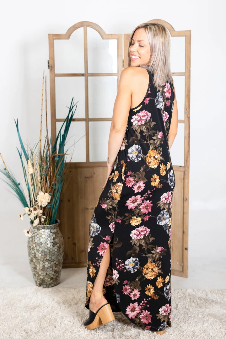 The floral print in this stunning maxi is to die for! We are loving the color combinations on that black background. With a relaxed fit, this top features a round neckline and rounded hem with side slits.