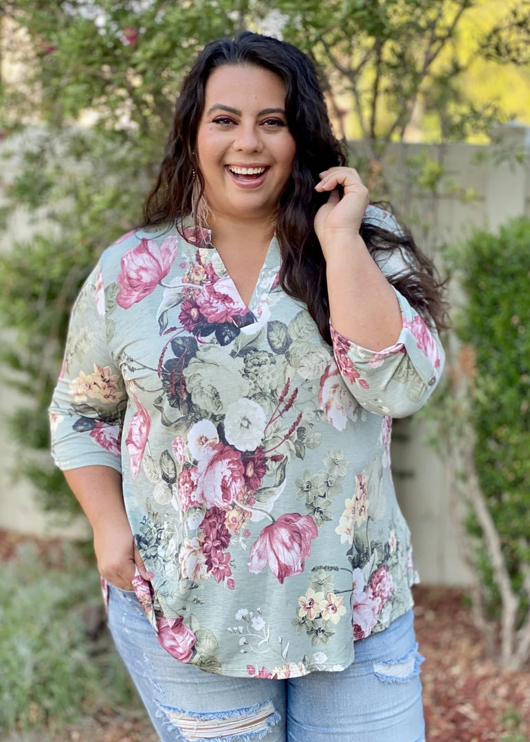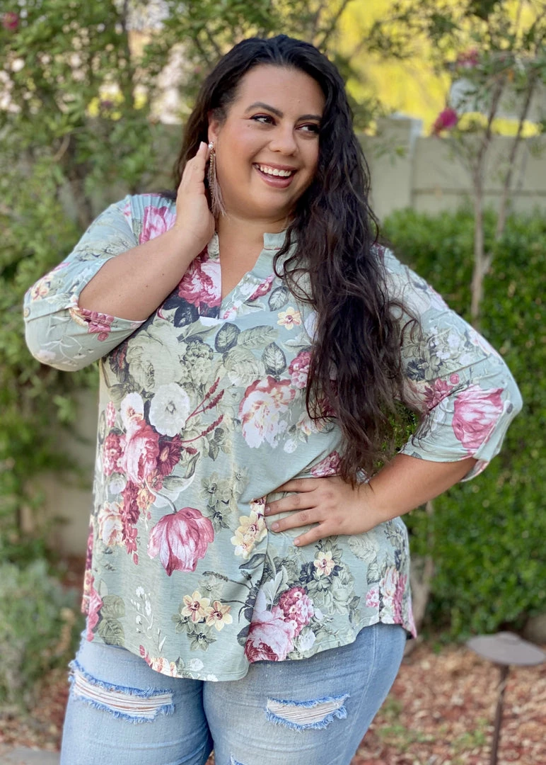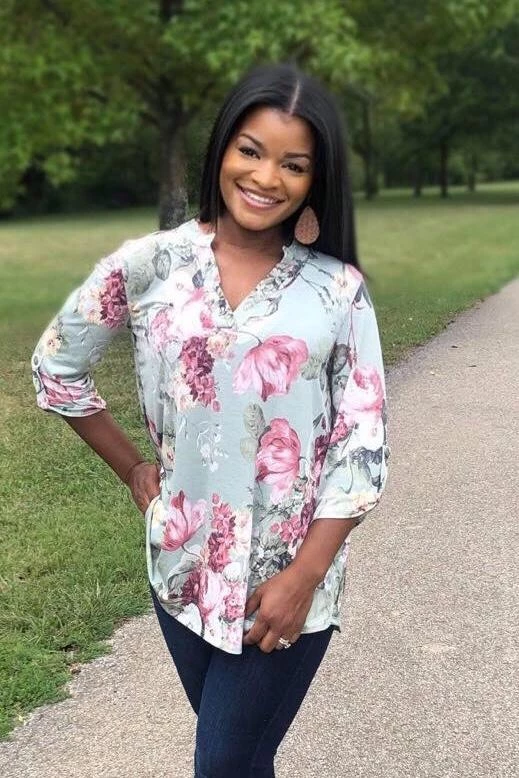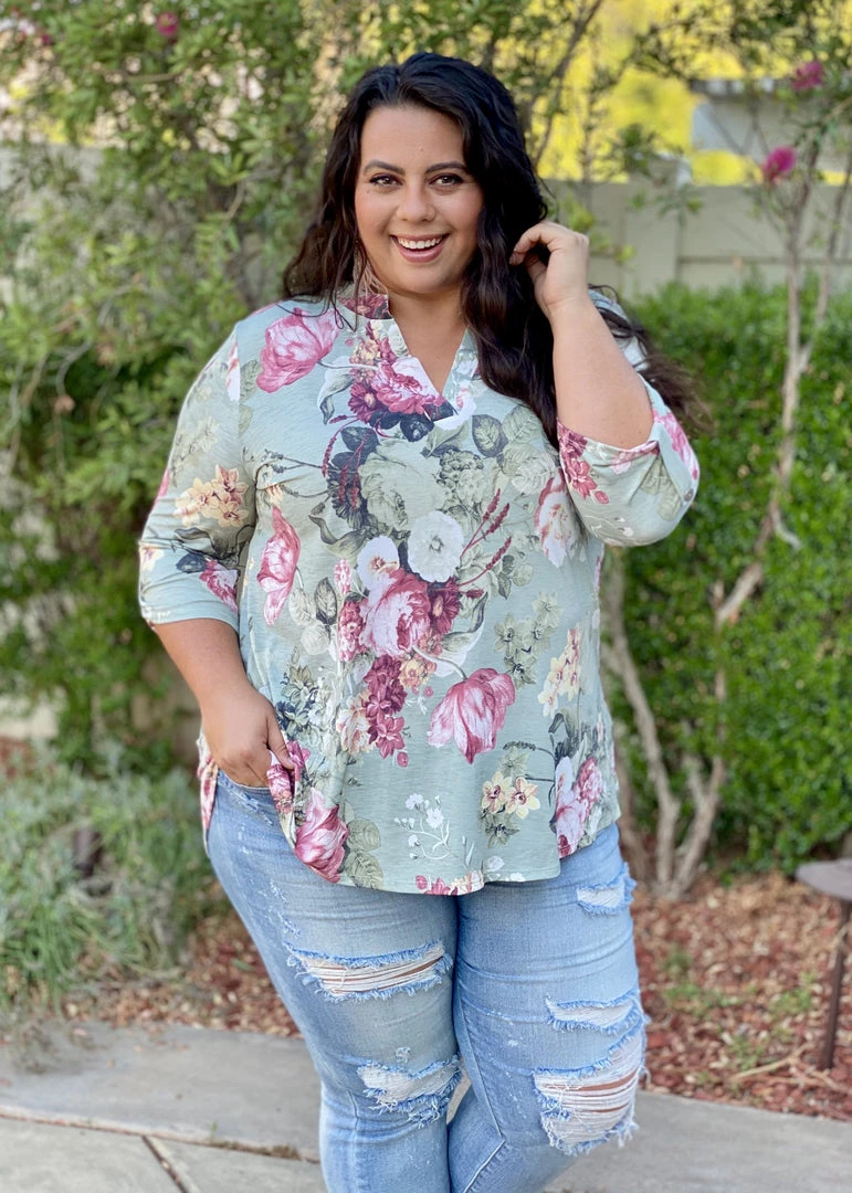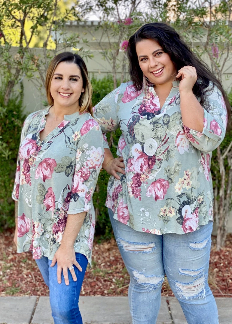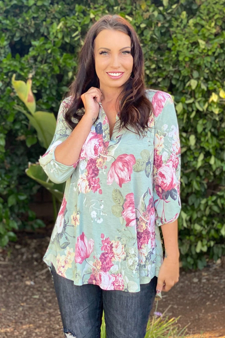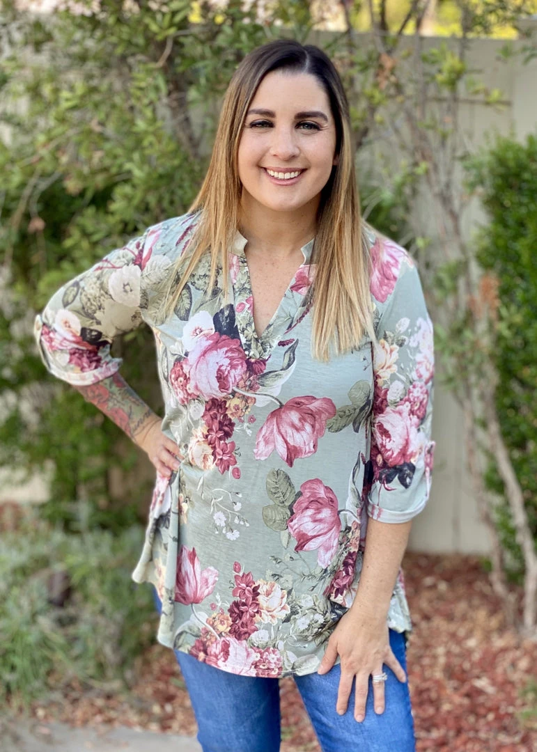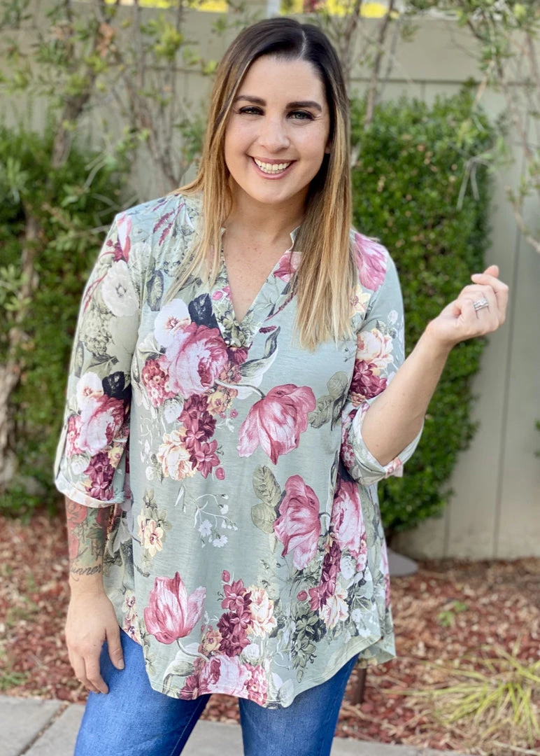 SearchingΒ for the perfect lightweight tunic? Look no further.Β TheΒ floral print makes this loose fitting top flattering for all body types. Featuring a banded collar, v-neck and buttoned 3/4 sleeves, this top will make gettingΒ dressed seem effortless.Β