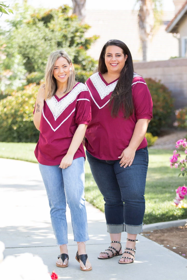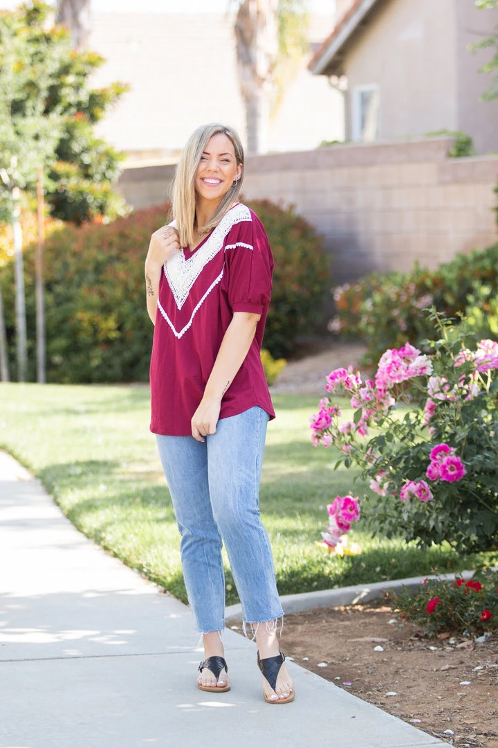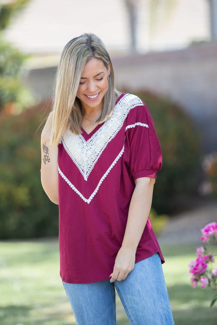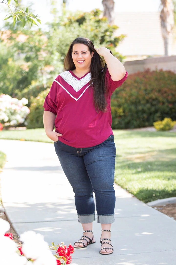We are loving this vintage burgundy short sleeve top, the color reminds us of relaxing on a summer day with a nice glass of Pinot Noir. With a relaxed fit, this top feature short cuffed dolman sleeves and gorgeous lace trim around the v-neck.Β