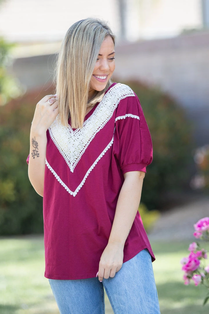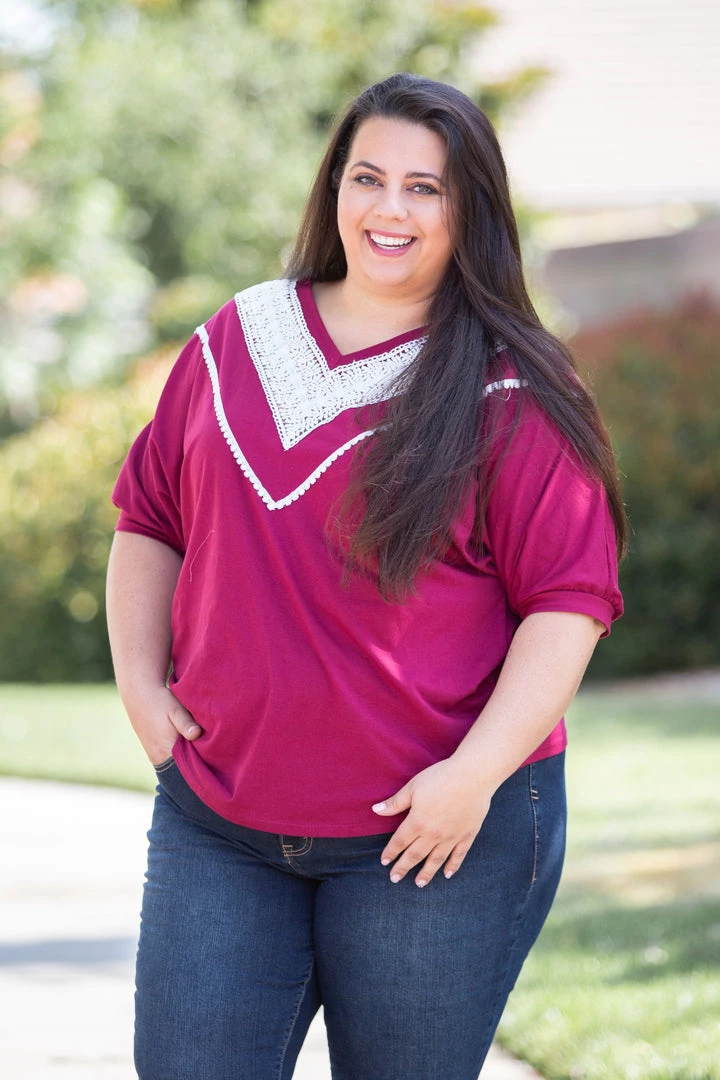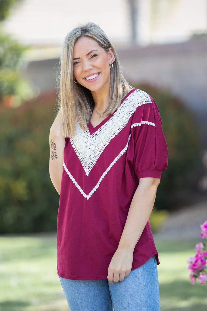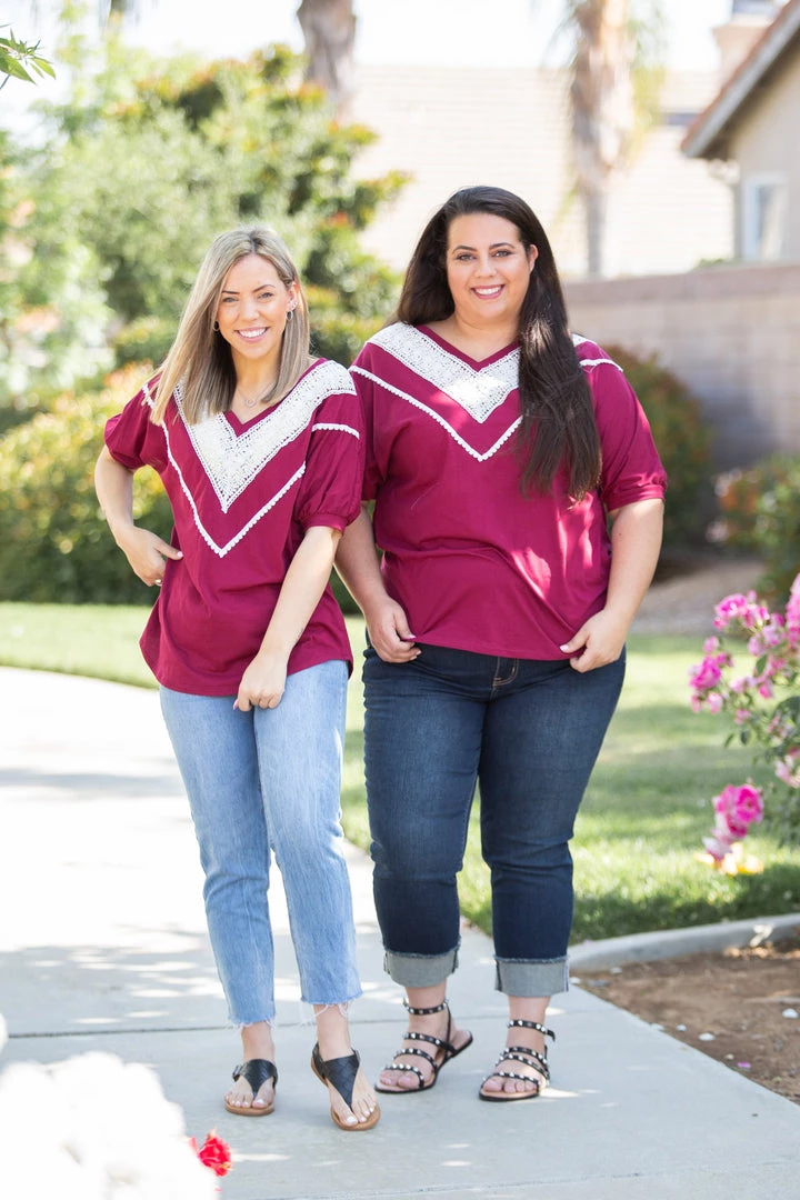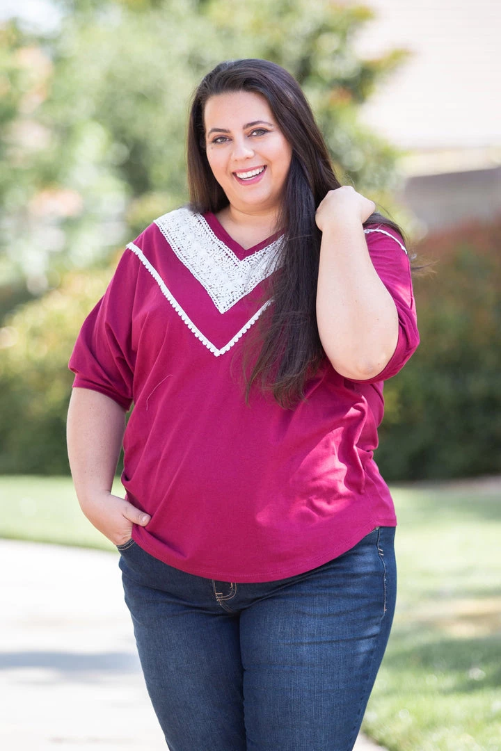 We are loving this vintage burgundy short sleeve top, the color reminds us of relaxing on a summer day with a nice glass of Pinot Noir. With a relaxed fit, this top feature short cuffed dolman sleeves and gorgeous lace trim around the v-neck.Β