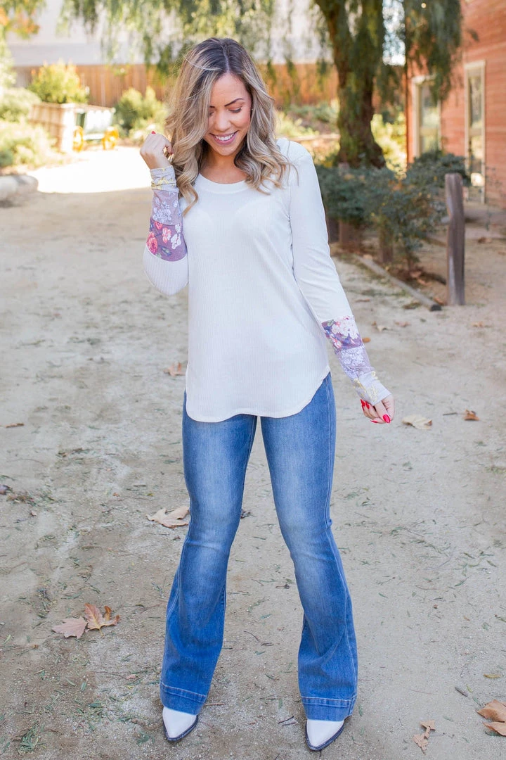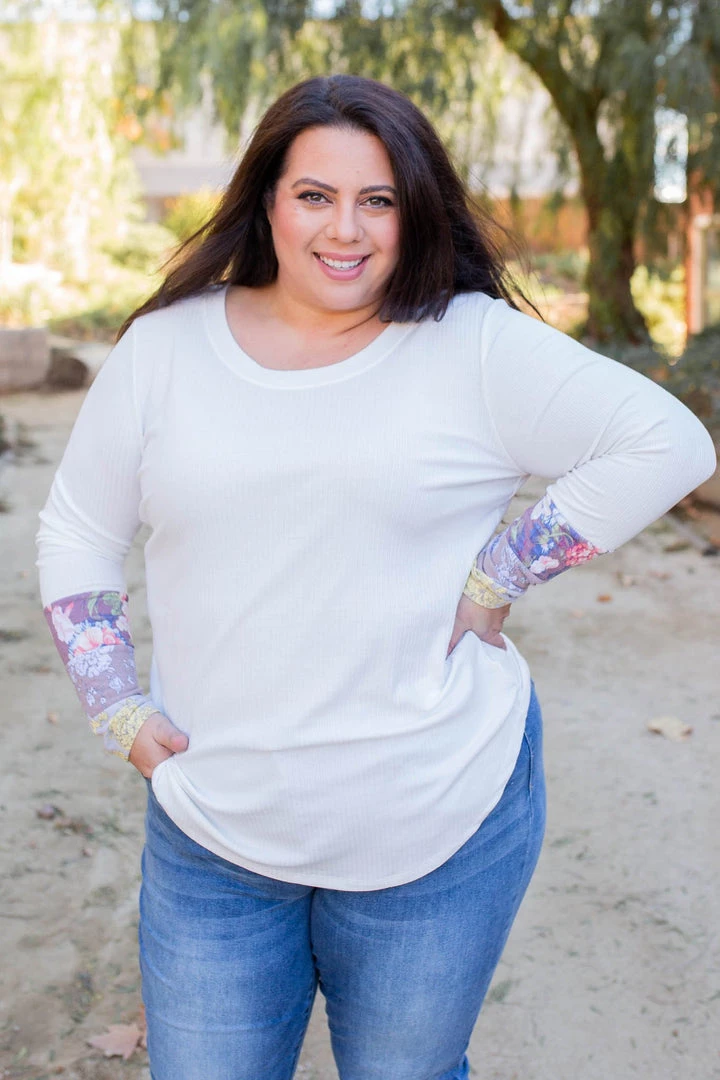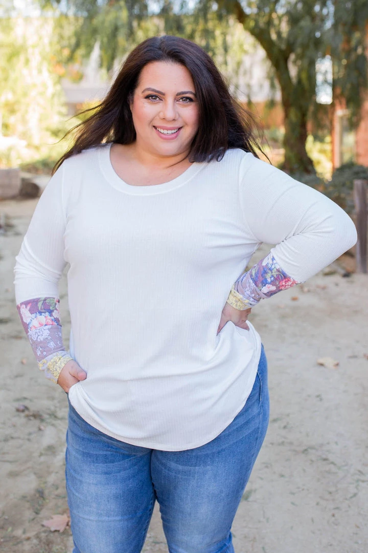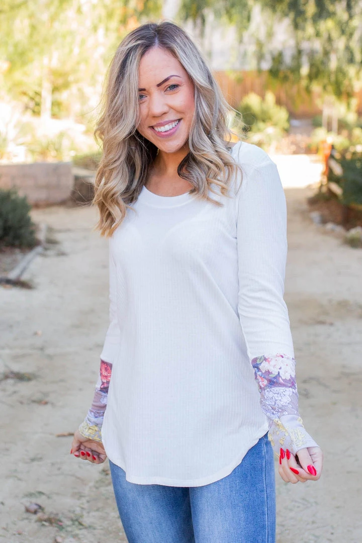 This long sleeve ribbed top is filled with the most pleasant blooms on the colorblocked sleeves. With a relaxed fit, this top features long sleeves, a round neckline and round hem.Β Β