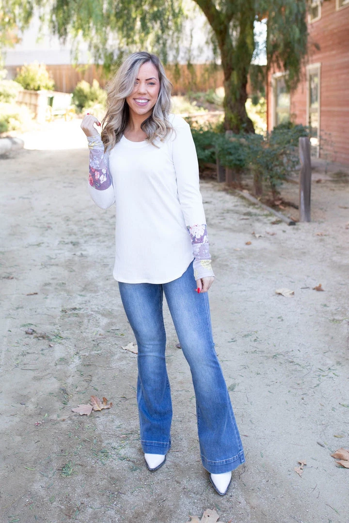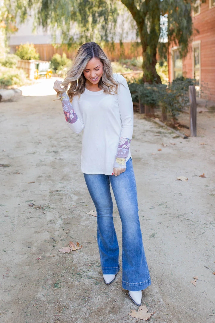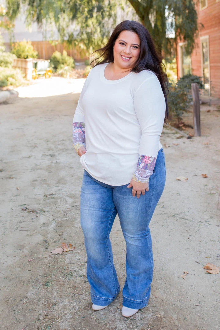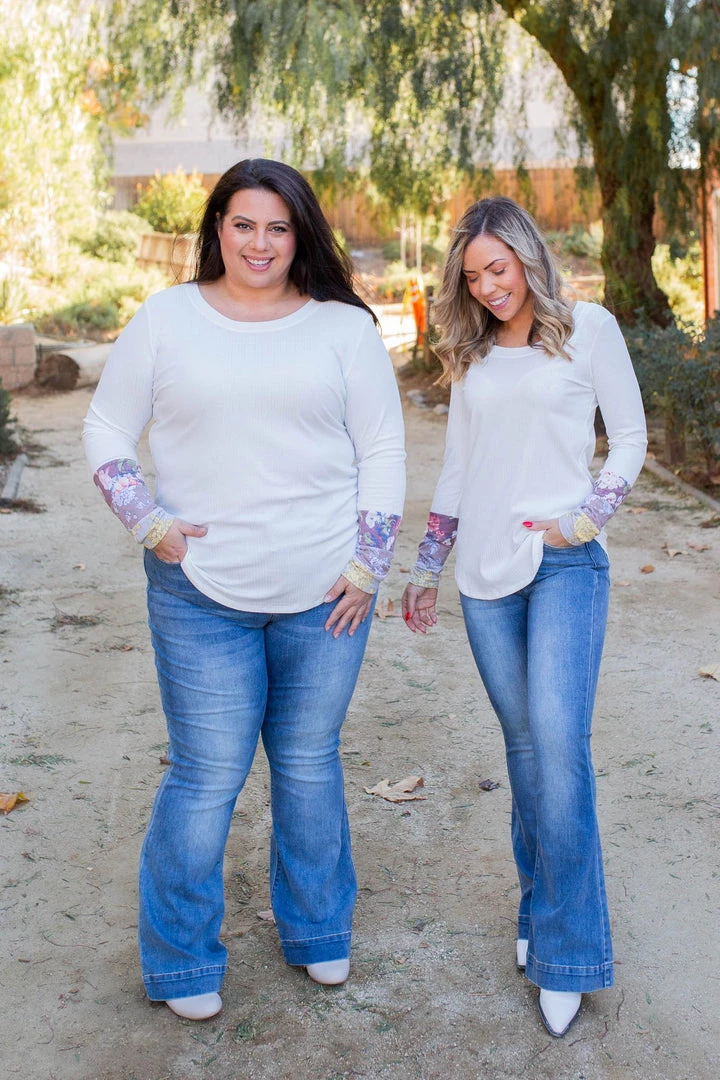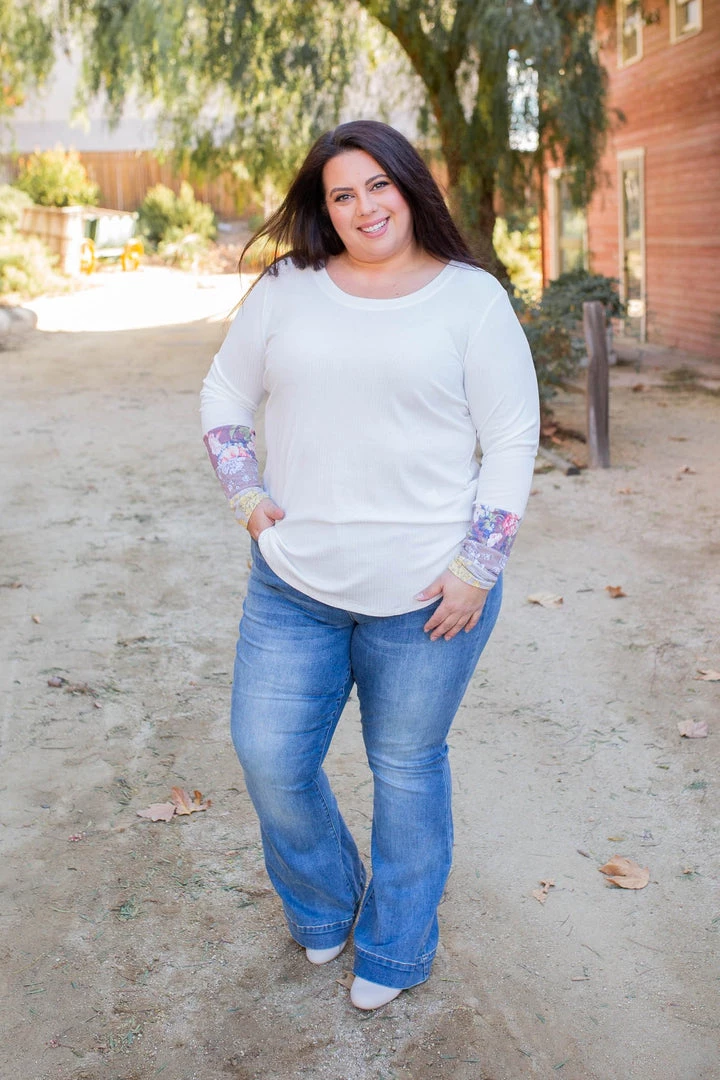 This long sleeve ribbed top is filled with the most pleasant blooms on the colorblocked sleeves. With a relaxed fit, this top features long sleeves, a round neckline and round hem.Β Β