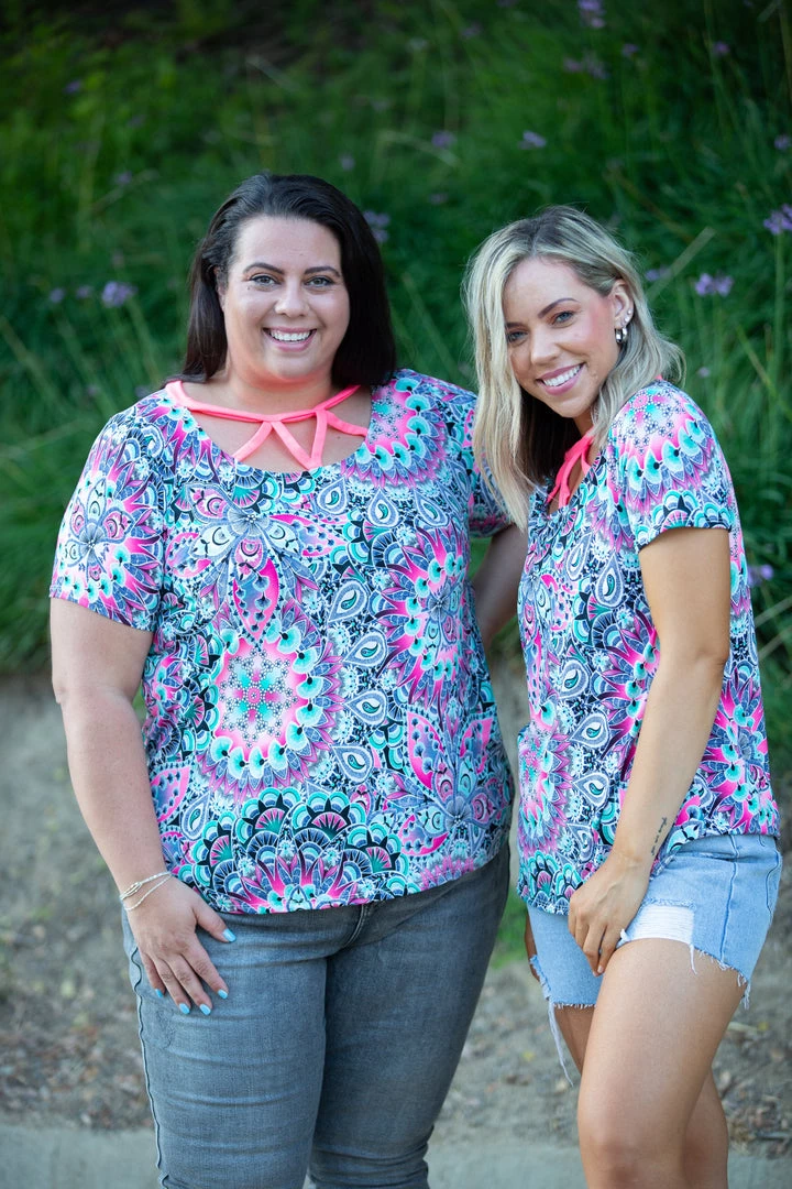 We are loving this neon psychedelic paisley print! If you’re looking for a top to really bring out your summer tan, this is the one! With a relaxed fit, this top features a round neckline with scoop neck cutout and criss cross detailing.Β Β Β Β