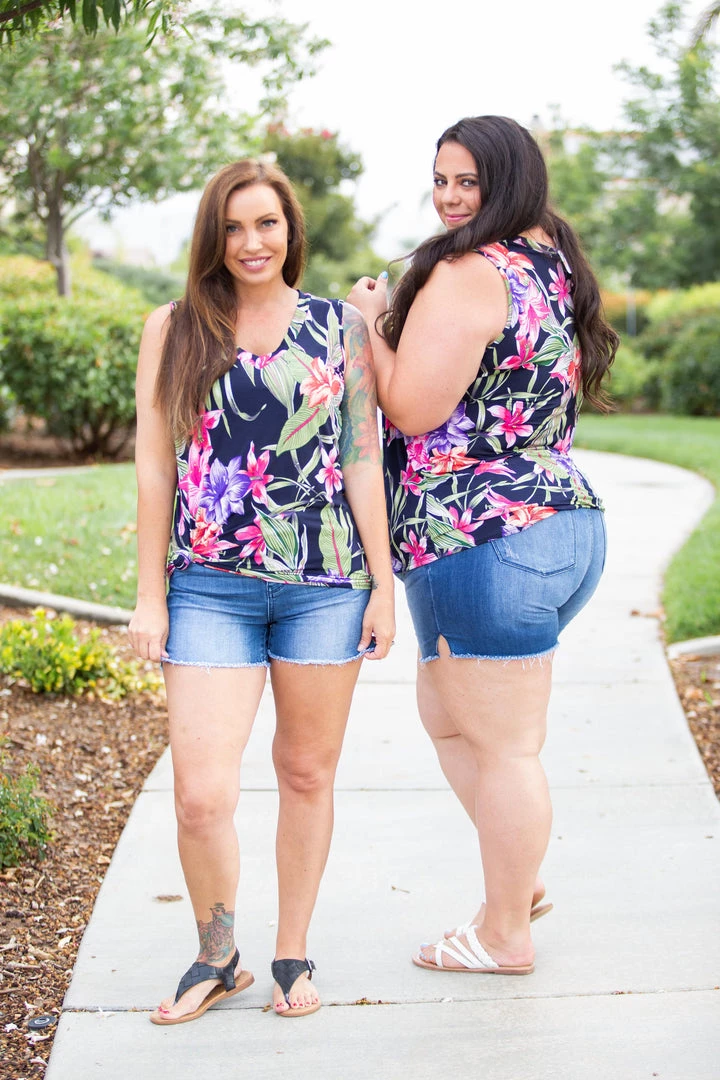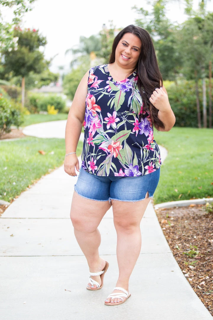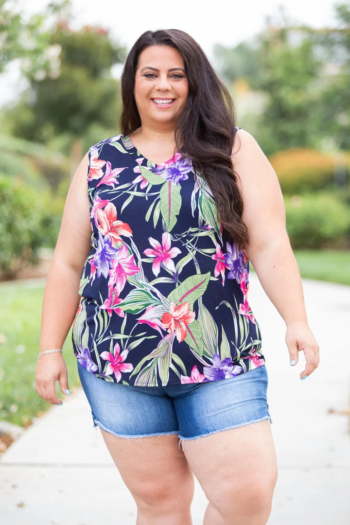 This sleeveless top is so fun and unique. We’re loving how those tropical flowers pop against the dark navy background. With a relaxed fit, this top features a v-neck and rounded hem.Β