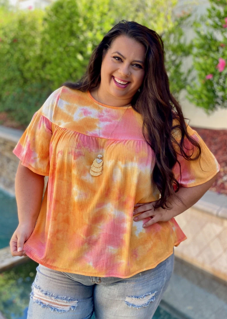 You will be as happy as a Ray of Sunshine in this gorgeous tie dye printed jacquard top! FeaturingΒ a round neckline, relaxed fit and ruffled short sleeves, this top will be your summer go to!Β Β Β