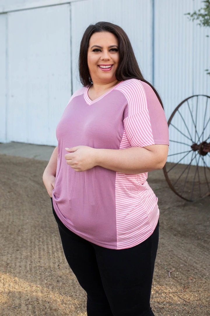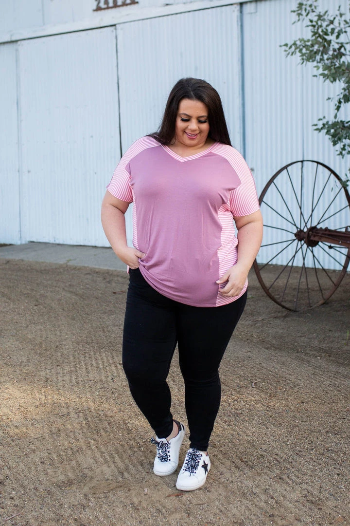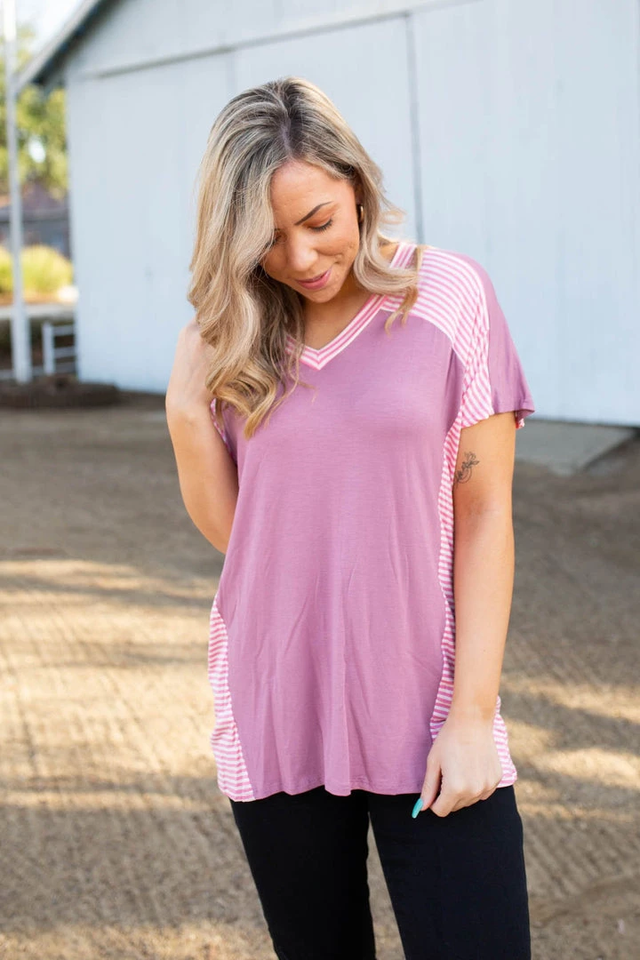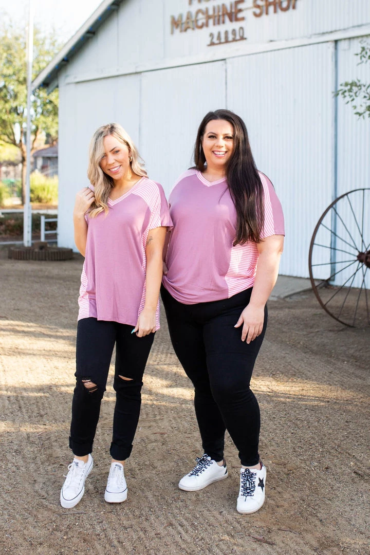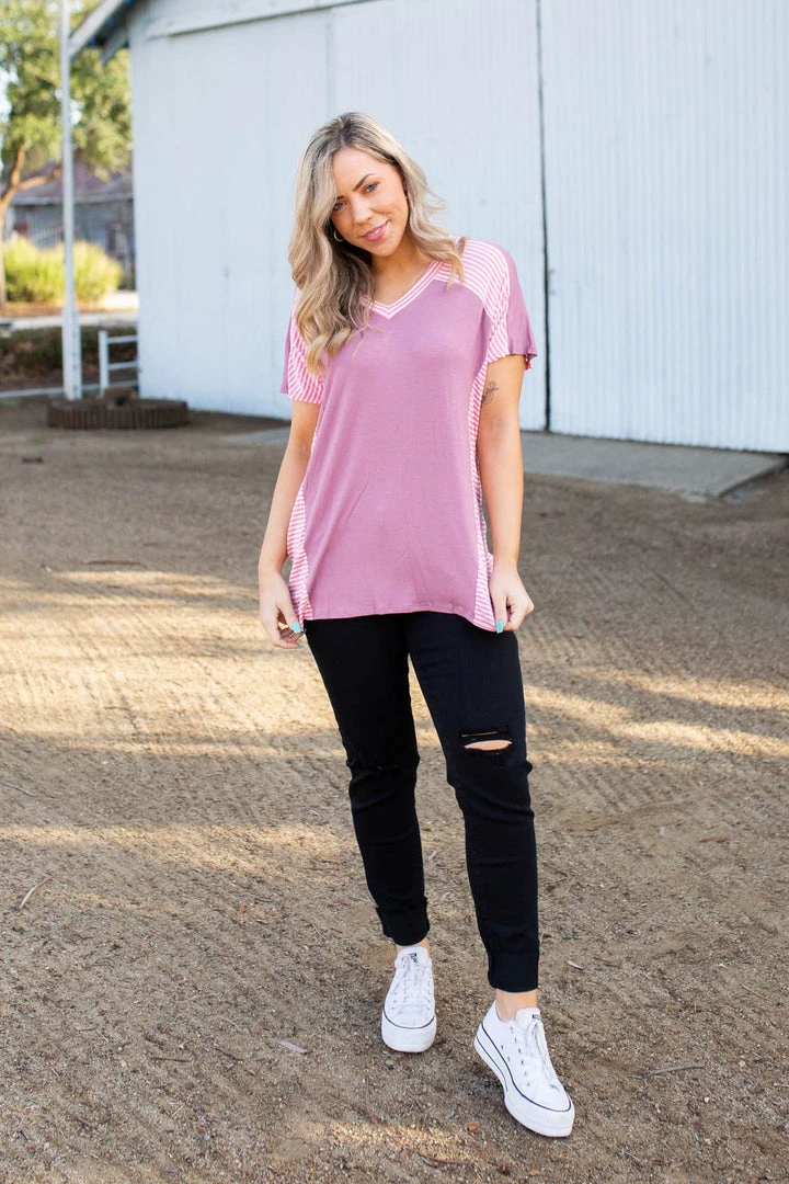We are loving everything about this short sleeve top. The fabric is so incredibly soft, and the contrasting stripes really make this piece unique. With a relaxed fit, this top features short dolman sleeves and a v-neck.