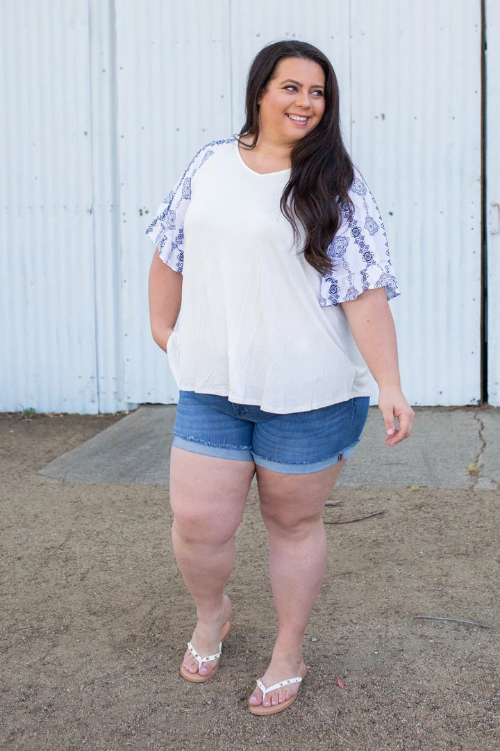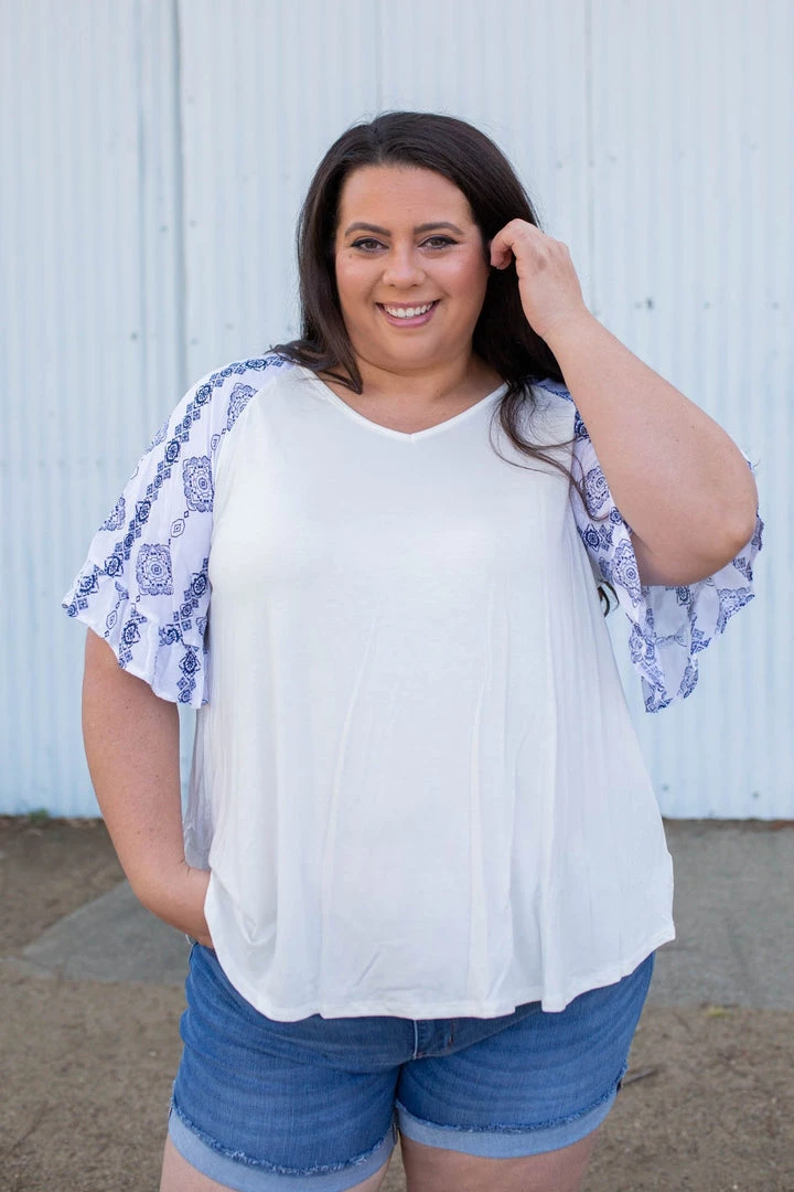 This ruffle sleeve top is as stunning as royal Dutch delft. With a relaxed fit, this top features half ruffle sleeves, a subtle v-neck and rounded hem.Β