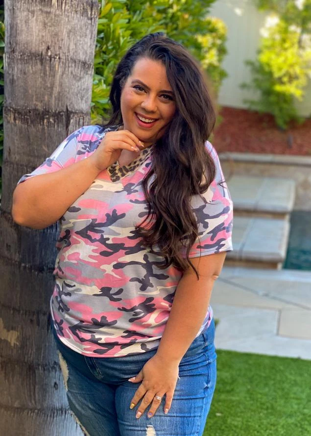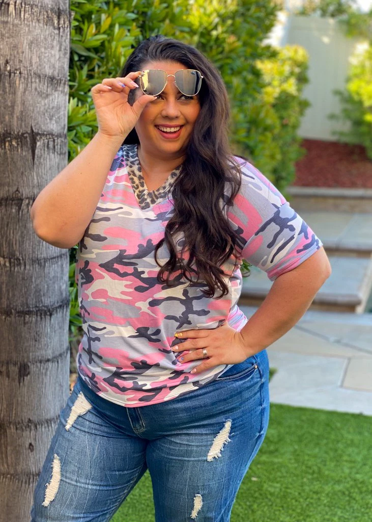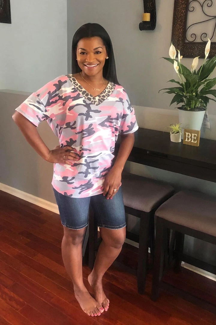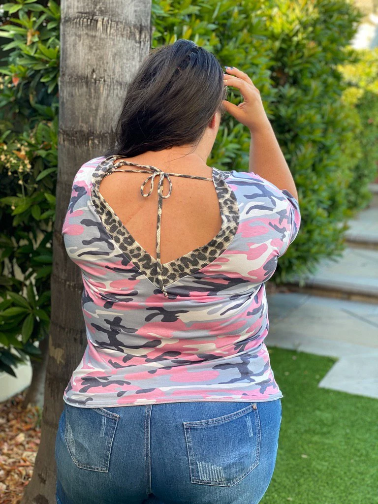 Camo and leopard?! Yes please!! This short sleeve tee features a v-neck, relaxed fit and the most amazing back tie detail.