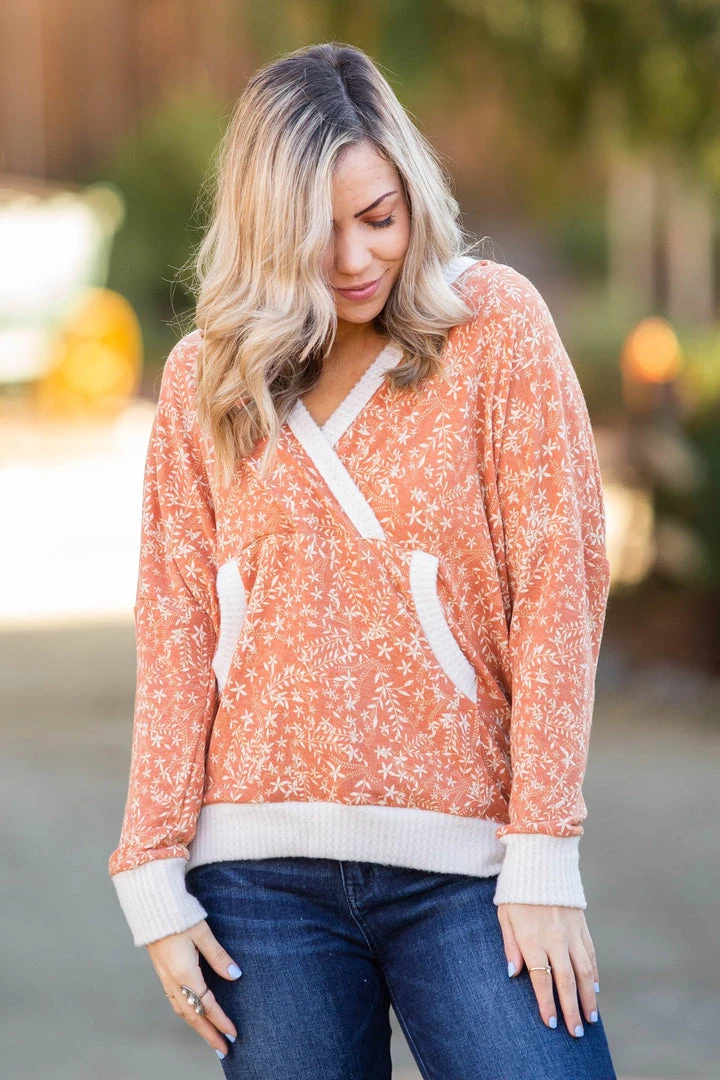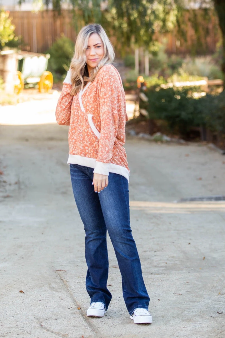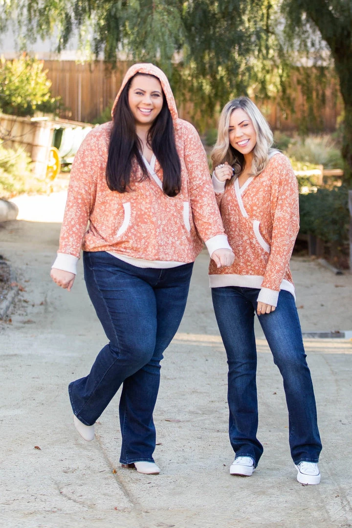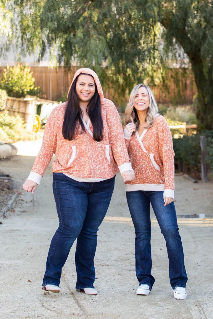 We are head over heels for this rustic floral hoodie. The v-neck and waffle knit trim really give this piece such a unique look. Featuring a hood and kangaroo pocket, this piece will become your next favorite!Β Β