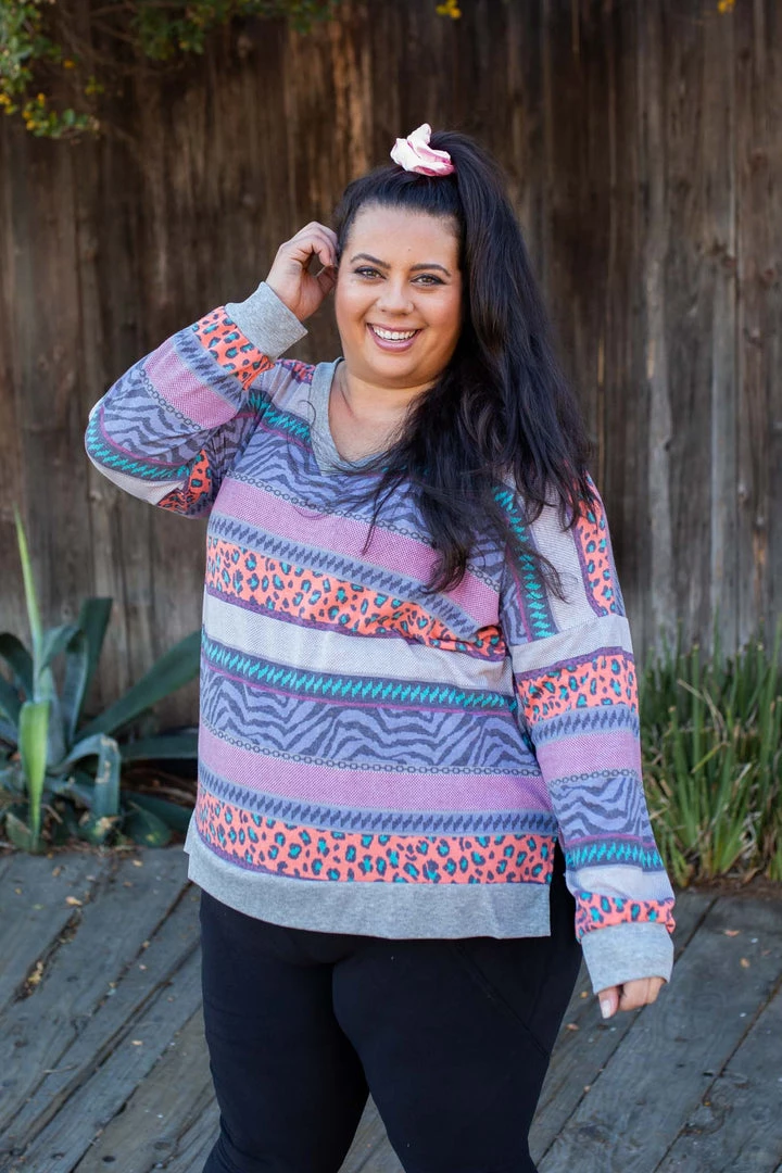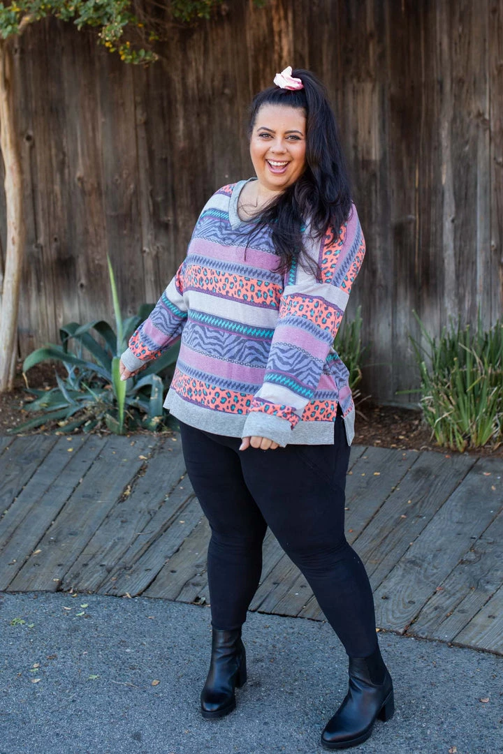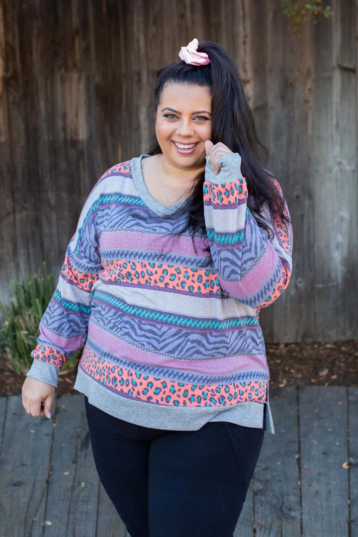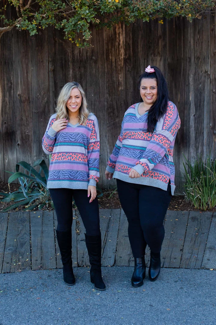 This vibrant striped long sleeve top takes us right back to the 80’s, and we’re loving it.Β Β FeaturingΒ long sleeves, aΒ v-neckΒ and banded hem and sleeves.Β .Β