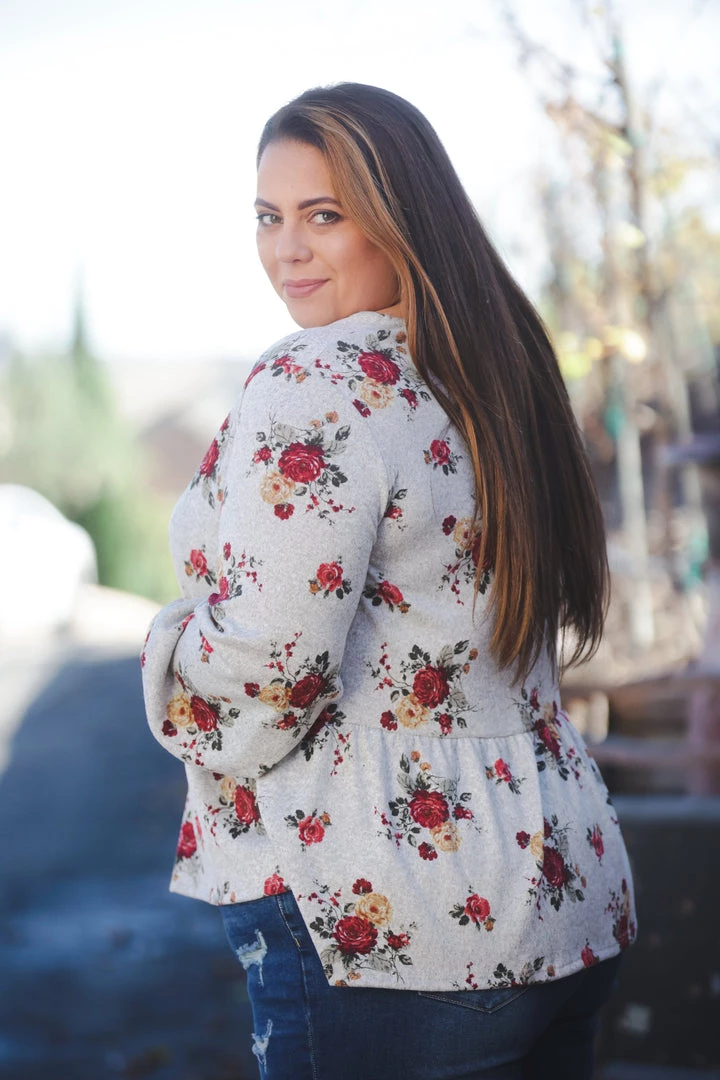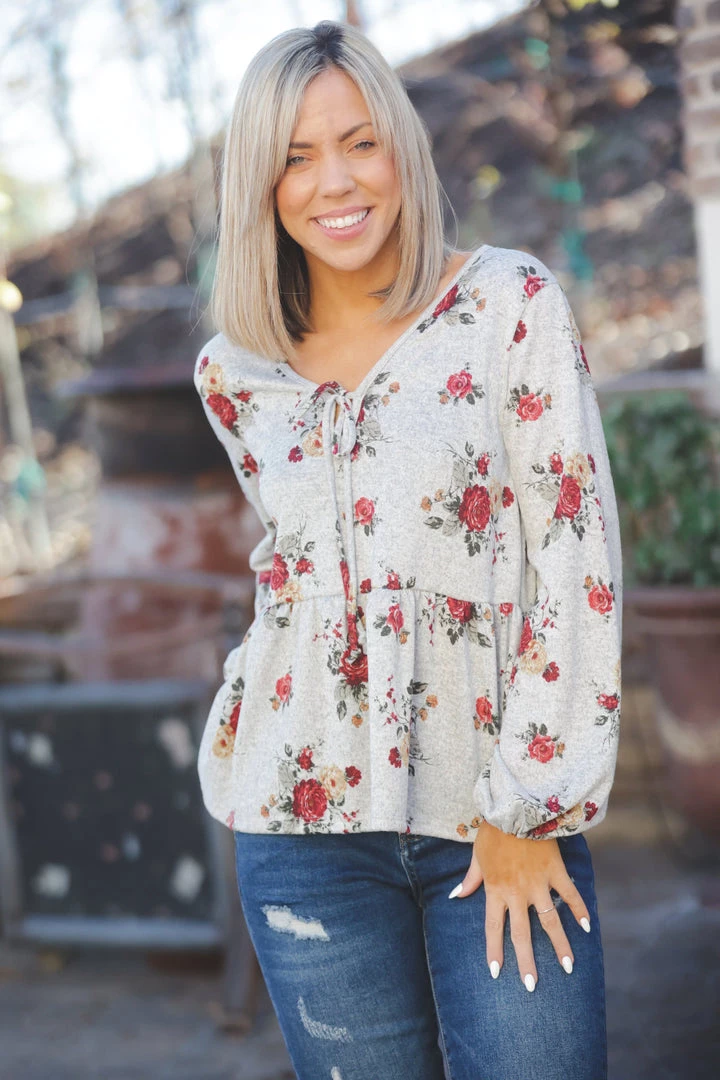 Made from THE softest brushed hacci, this long sleeve peplum top will feel amazing on while keeping you warm and stylish. With a relaxed fit, this top features long bubble sleeves, a v-neck with self tie detail and peplum hem.Β Β Β