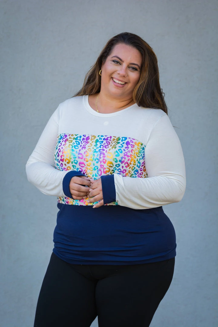 Add a little shimmer in your life with this gorgeous color block top. With a semi-fitted fit, this top features long cuffed sleeves, a round neckline and banded hem.