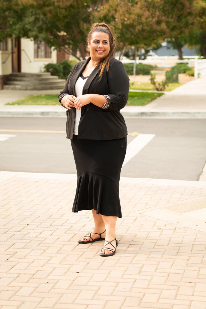 - CallieΒ is 5’8 wearing size 3X (Paired withΒ Classy Lace Trim Tank andΒ Business Pizzaz Blazer)