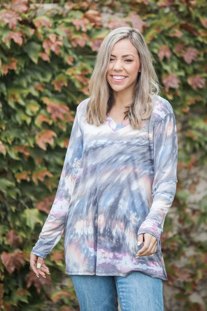 This gorgeous tie dye reminds of the northern lights and it makes us want to stare at it for hours.Β Featuring a v-neck, long sleeves and relaxed fit, this everyday casual top will be your next go-to.Β Β