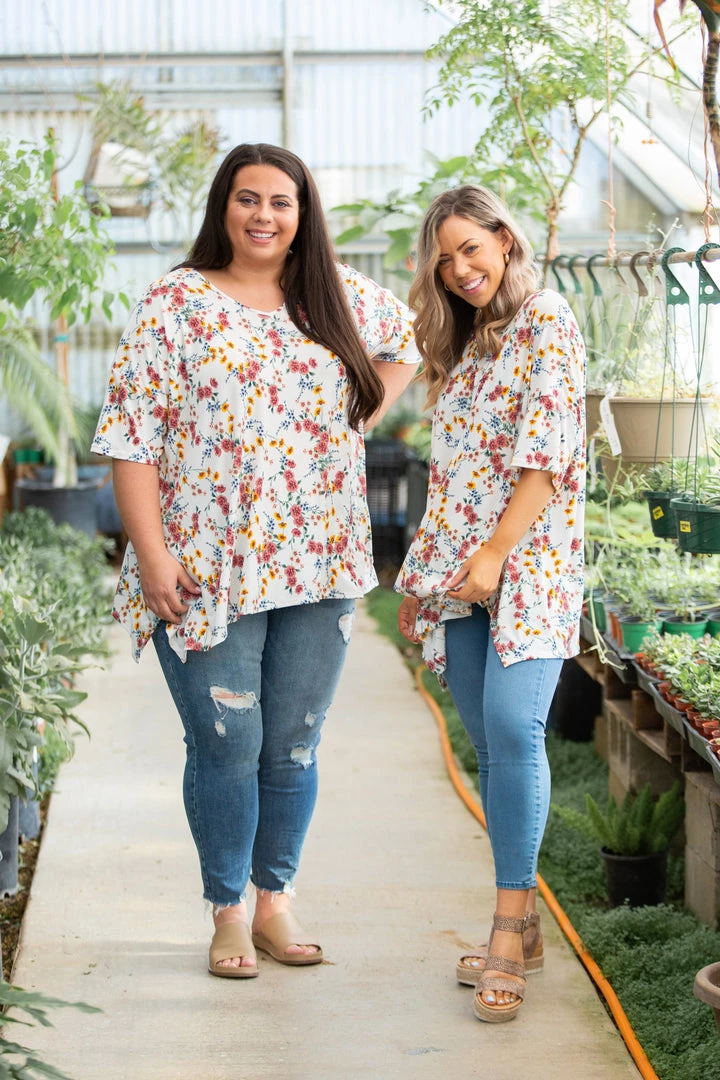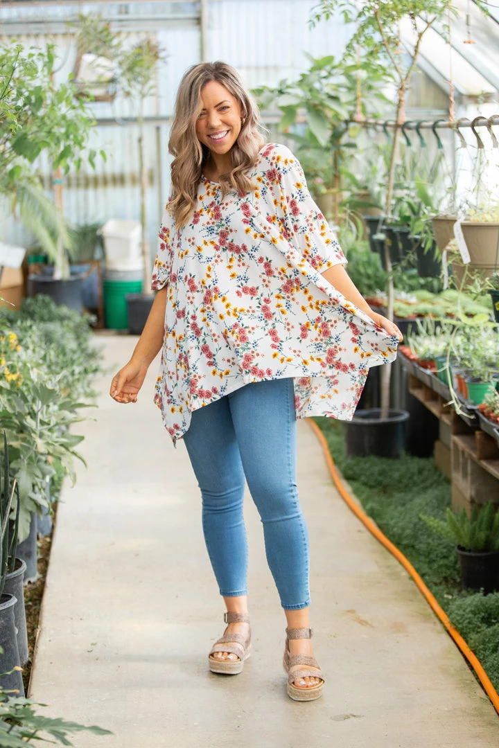 Spring showers bring May flowers and this gorgeous short sleeve top is as beautiful as those Spring blossoms. With a relaxed fit, this top features short sleeves, a v-neck and an asymmetrical sharkbite hem.Β