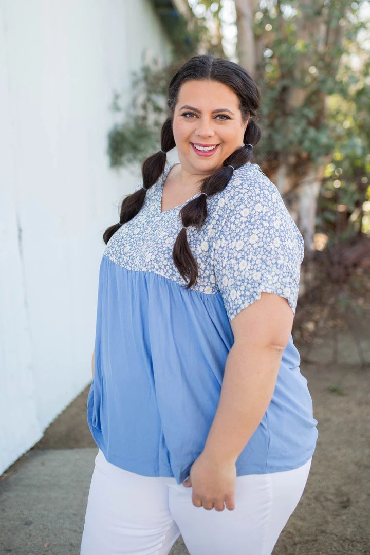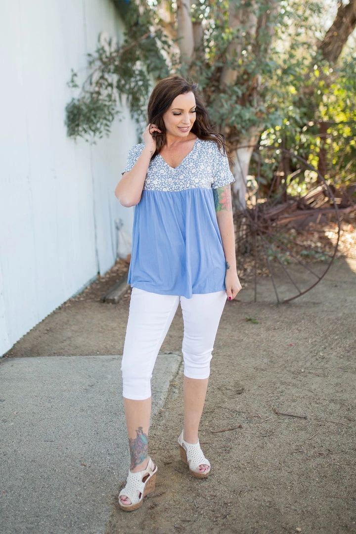 This is the perfect spring top! We are loving the daisy print on this gorgeous sky blue background. With a relaxed fit, this top features short sleeves and a v-neck.