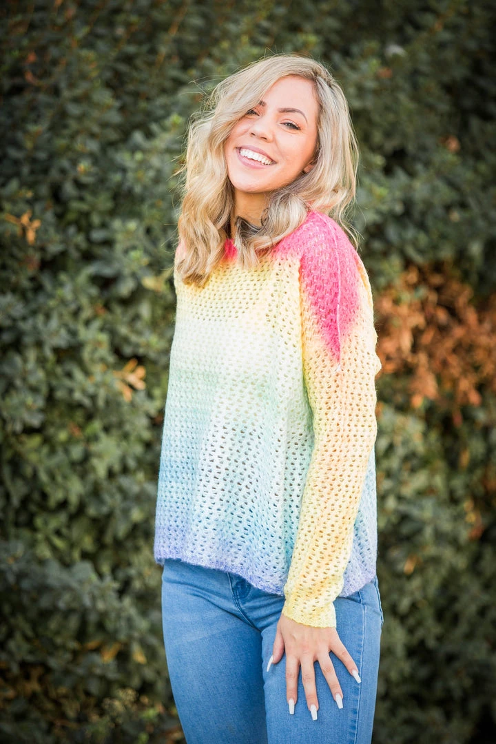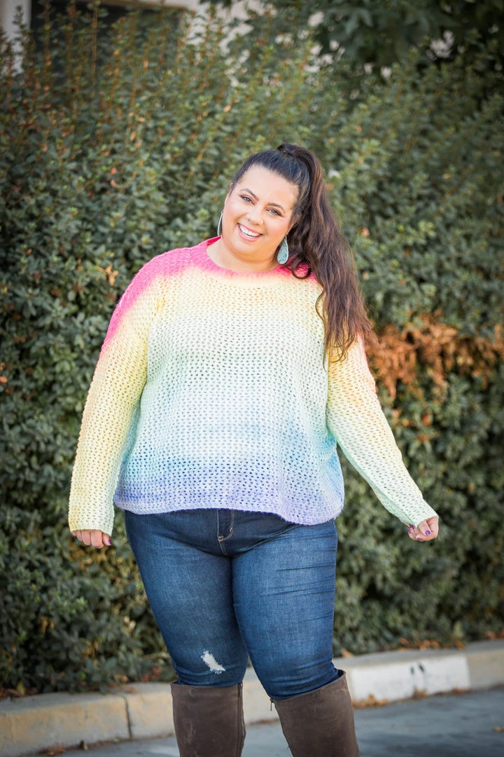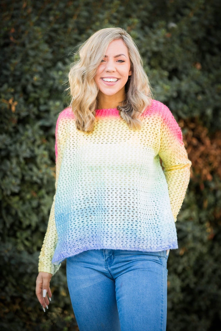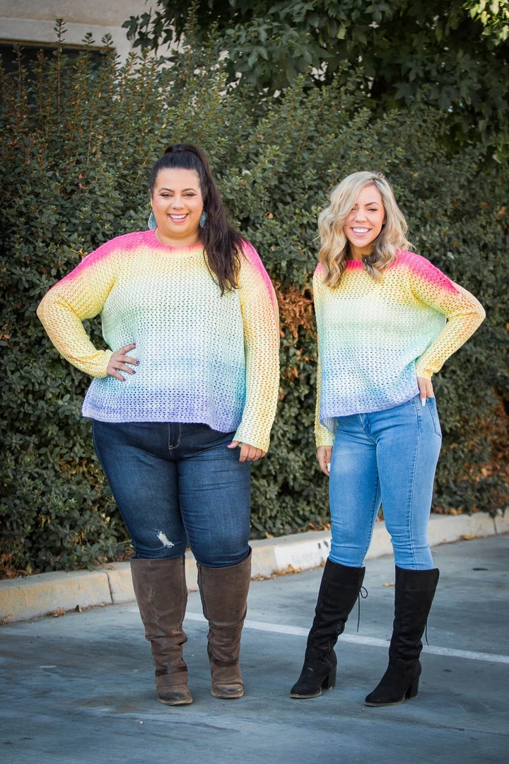 Starlite, Starbright, first sweater I want to wear tonight! This amazing rainbow colored knit sweater is not only gorgeous, but it’s also made from the softest knit. Featuring a round neckline long sleeves and cropped look, this sweater can be worn alone, or layered over a cami or flowy tee. .