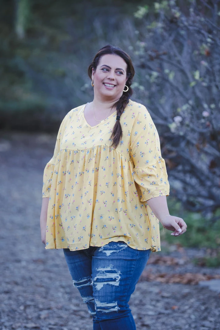 Sunshiny Days are here to stay with this lovely 3/4 sleeve babydoll. With a relaxed fit this top features a v-neck, 3/4 sleeve bell sleeves and empire waist.Β Β Β