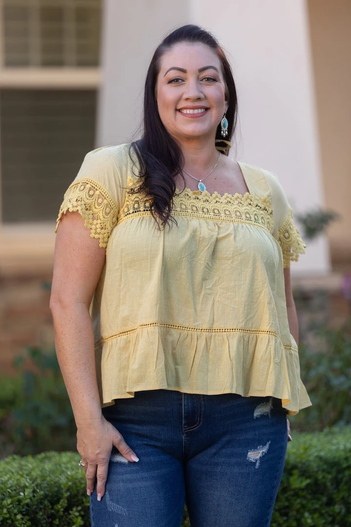 This stunning woven top is as sweet as honey! We are absolutely swooning over the lace details and open self tie back. With a relaxed fit, this top features a square neckline with lace trim, short sleeves…also with lace trim and ruffled hem.