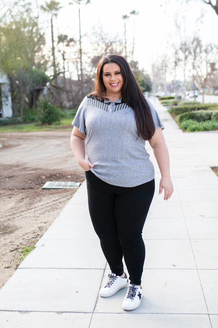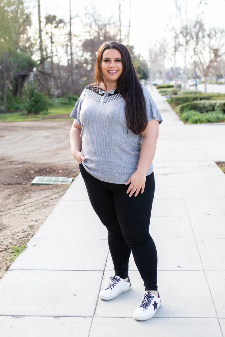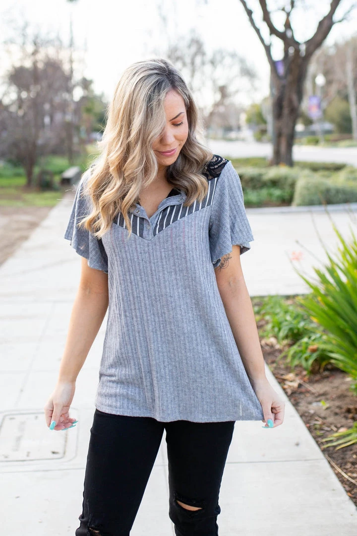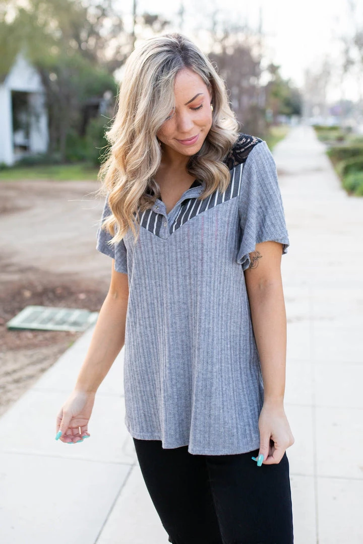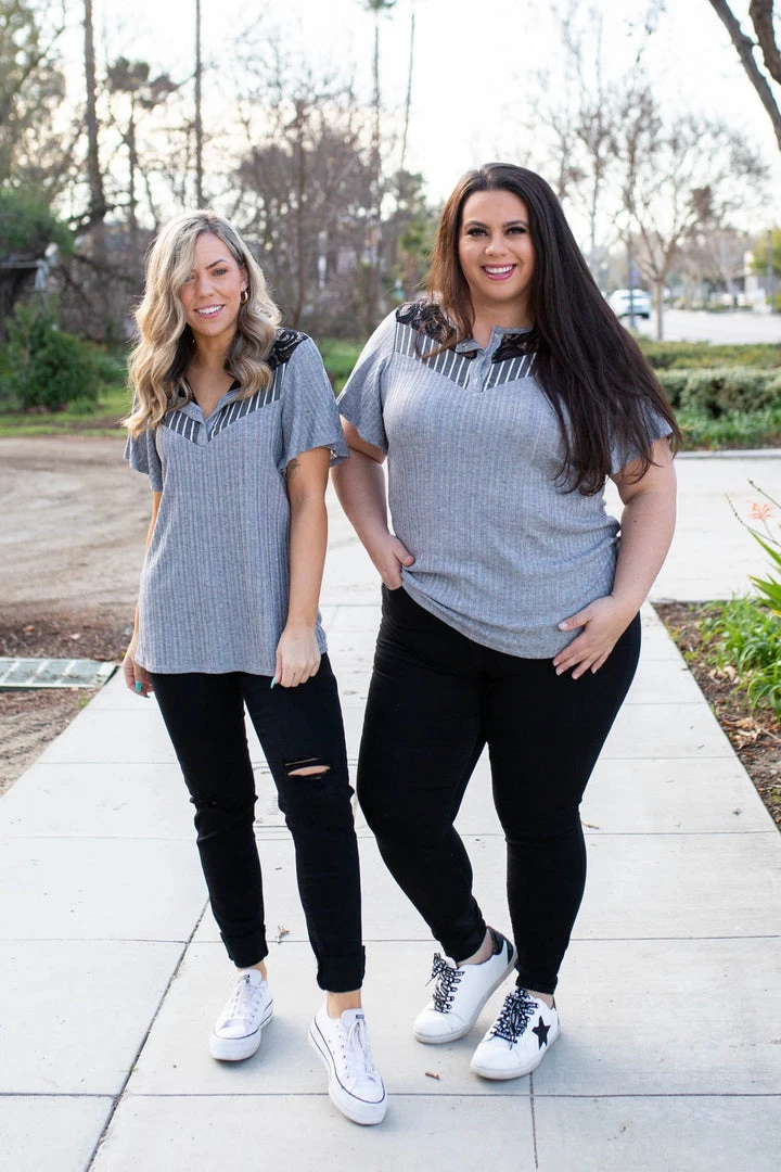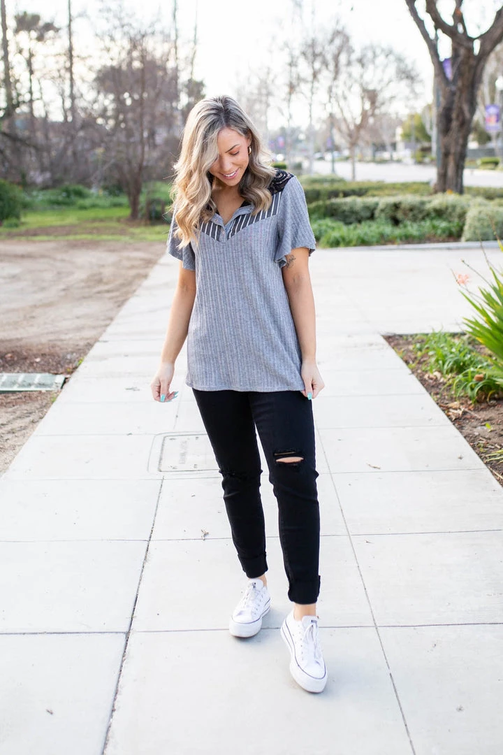 These short sleeve top is sheer perfection. The fabric is pure decadence and we are loving the subtle color blocking on the neckline. With a relaxed fit, this top features short flare sleeves and a round neckline with functioning button snap details.Β