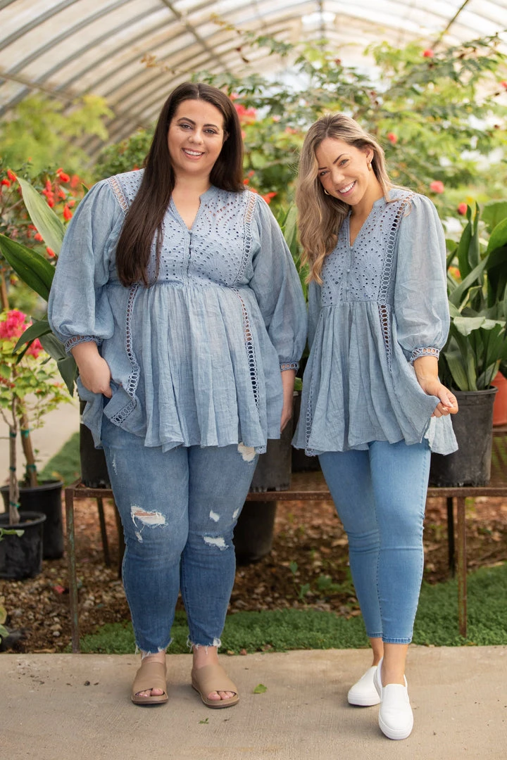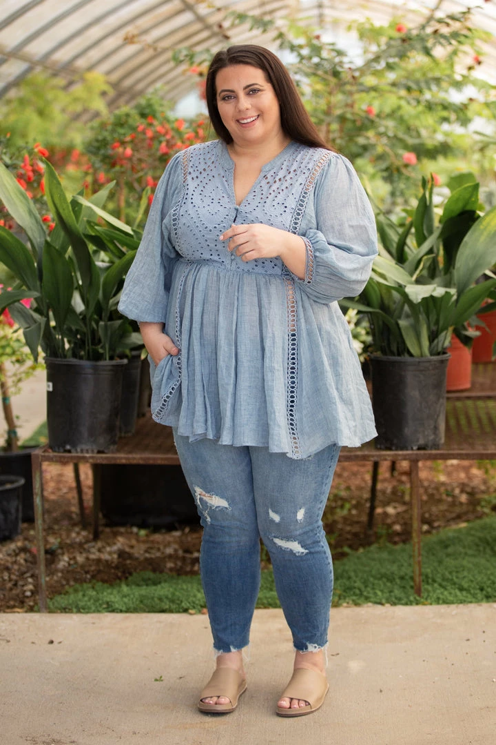 This high end woven blouse will be your go to when you’re out and about. The lightweight fabric is perfect for those warmer months, and the interior lining on the chest makes this top so easy to wear. With a relaxed fit, this tunic length top features a v-neck with functioning button details, lace trim and 3/4 sleeves.
