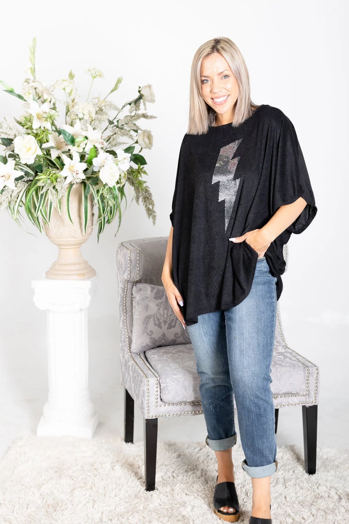 We are loving this oversized knit boxy tee! What a perfect transitioning piece?! With a super relaxed fit (you can easily size down), this top features a sequin lightning bold, round neckline and short dolman sleeves.