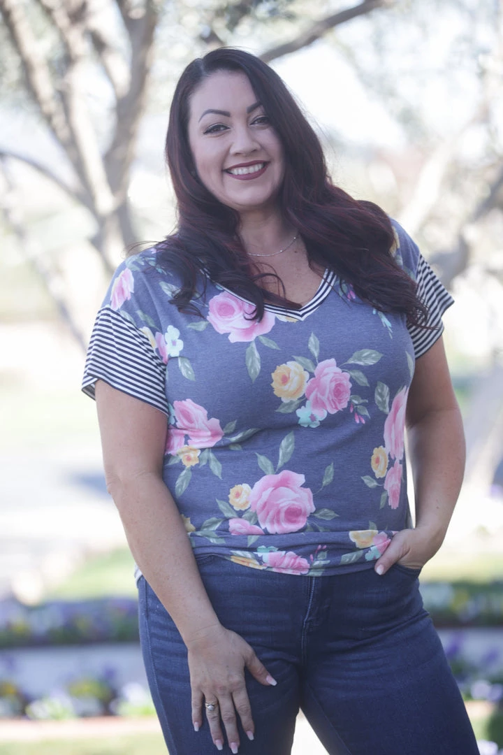 This navy floral and striped short sleeve will without the tides of time…it’s such a classic. With a relaxed fit, this top features a v-neck, short sleeves and rounded hem.Β