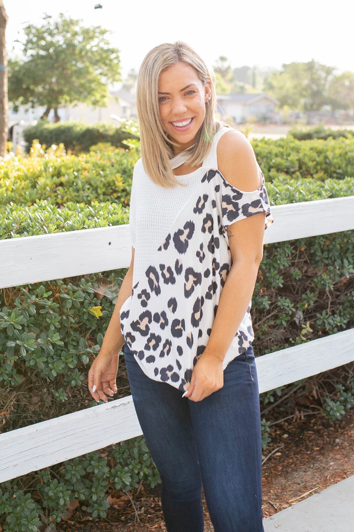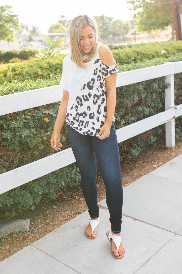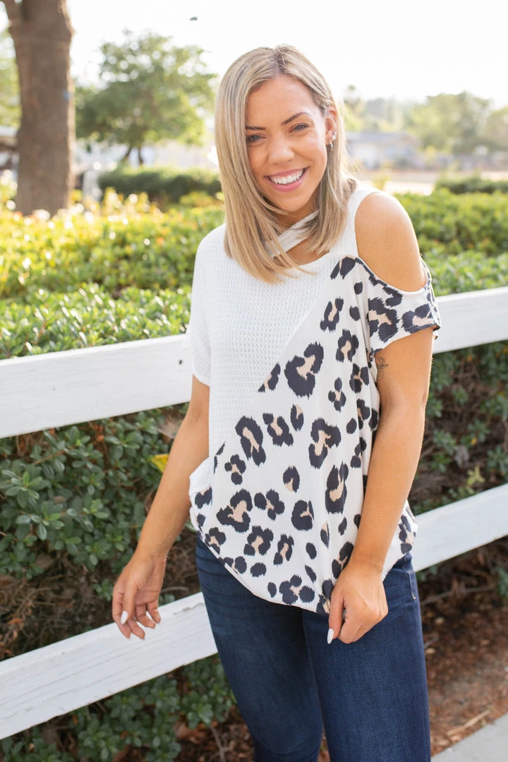 Let your wild side shine in this amazing short sleeve top. Featuring a relaxed fit, shortΒ sleeves with an open shoulder and strap detail.Β ThisΒ top will be the perfect unique addition to your wardrobe.Β