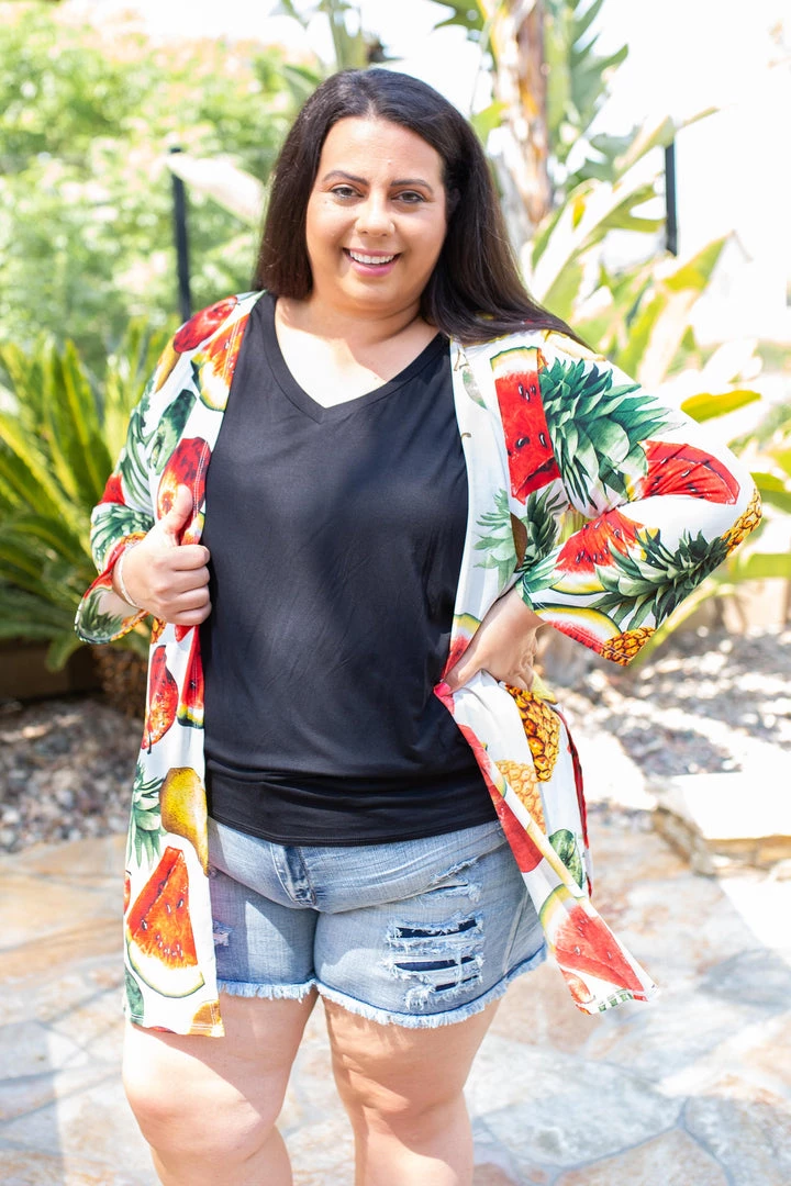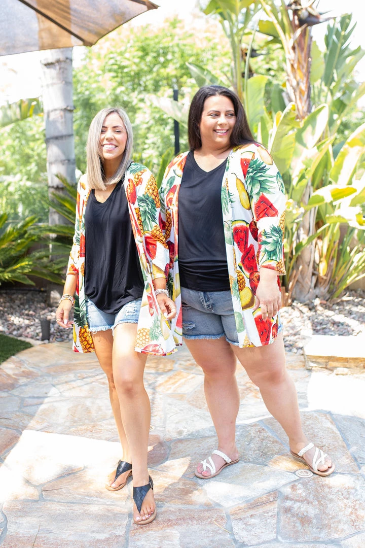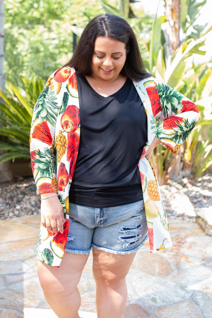 We are loving this fun summer fruit open face kimono cardigan. Not only is it the perfect lightweight cover for the season, but it can be worn a couple different ways. Wear it open faced or self tie the front for a completely different look.