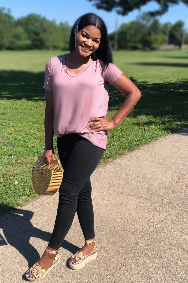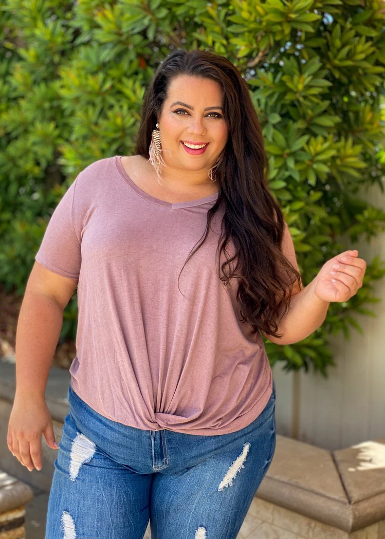 TheΒ gorgeous tunic features a loose fit, v-neck, short sleeves and a front knot detail. The perfect tunic…with a twist!!