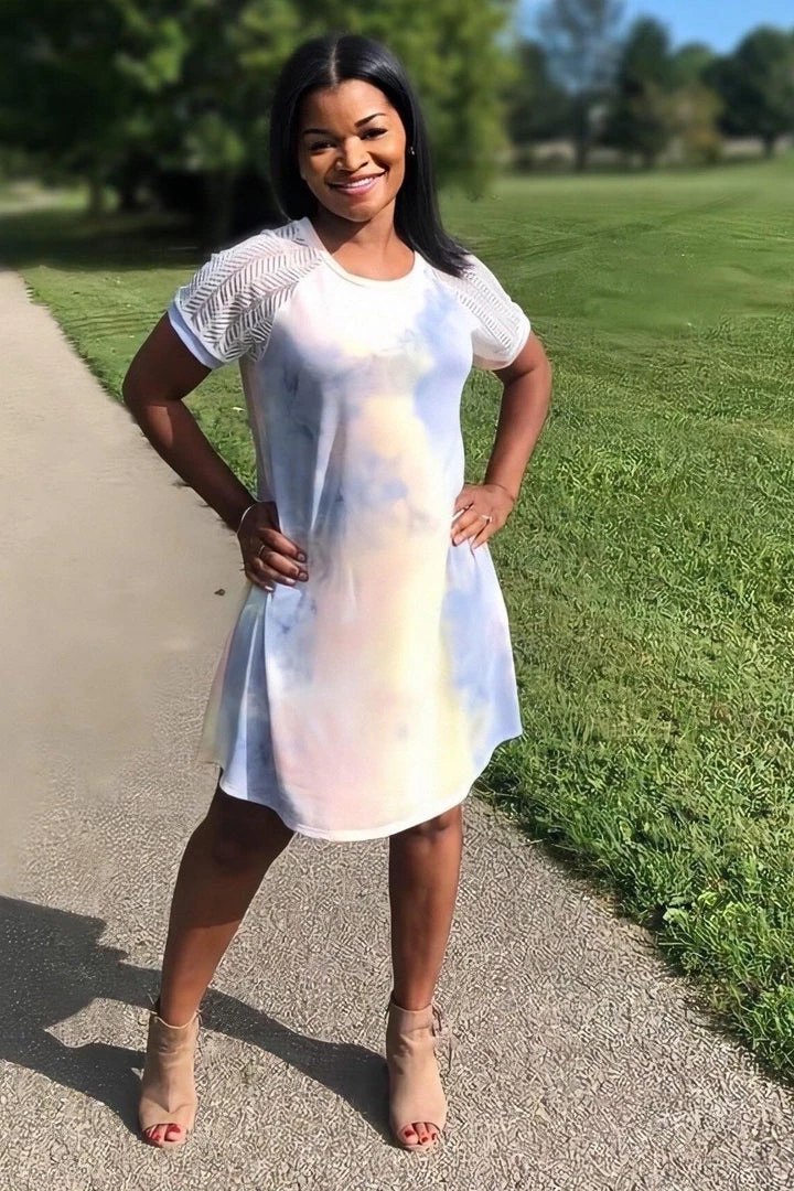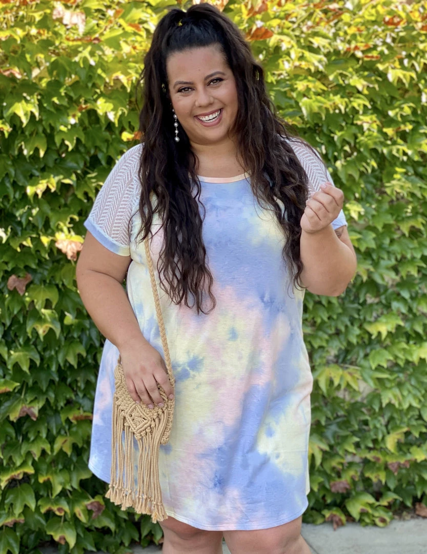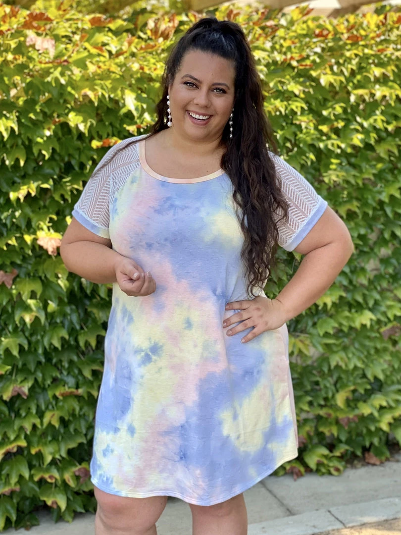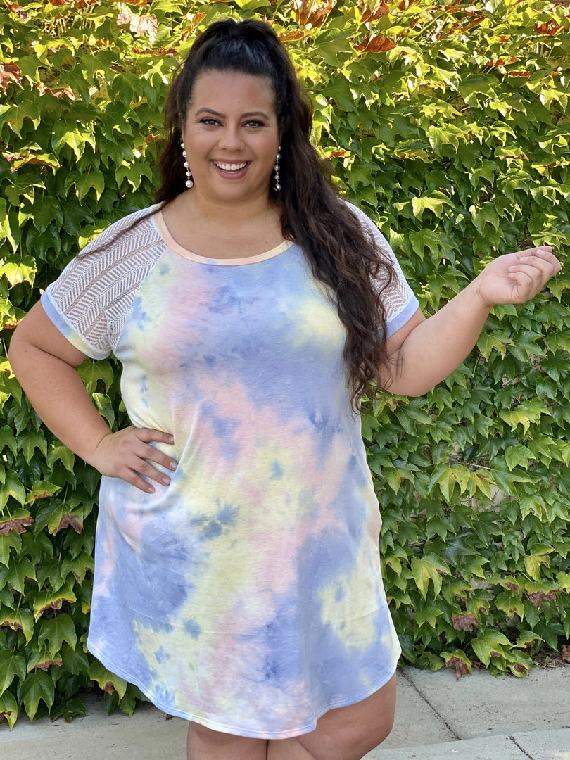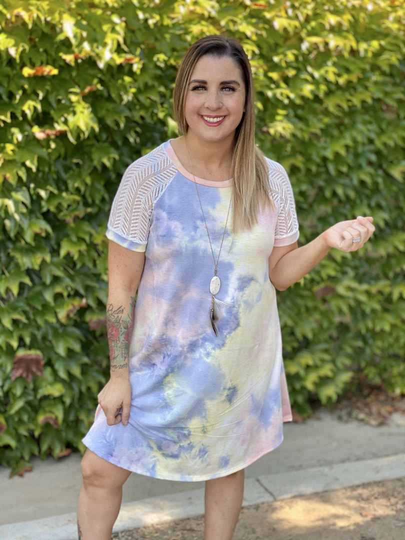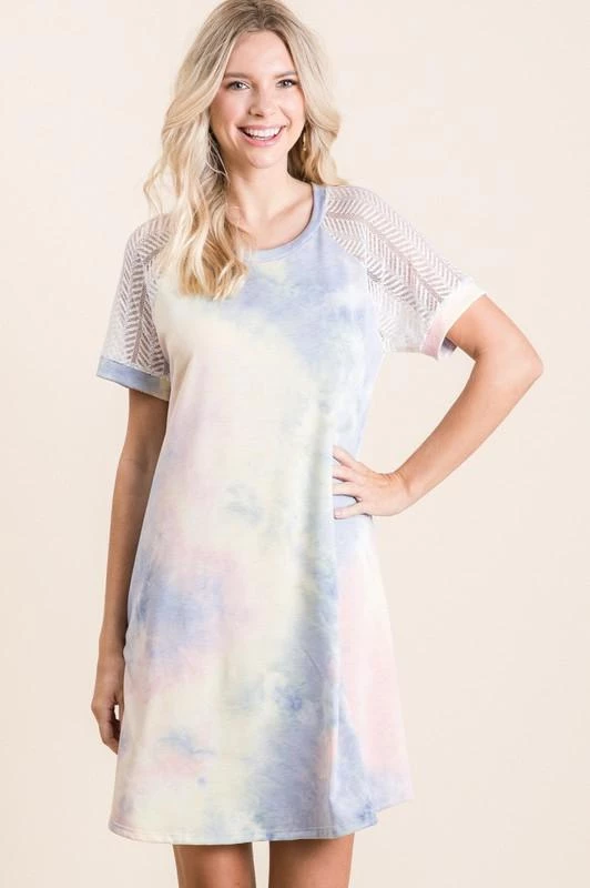 This dress is as amazing as a unicorn. We are loving the contrasting mesh sleeves on this tie dye a-line dress.Β Β