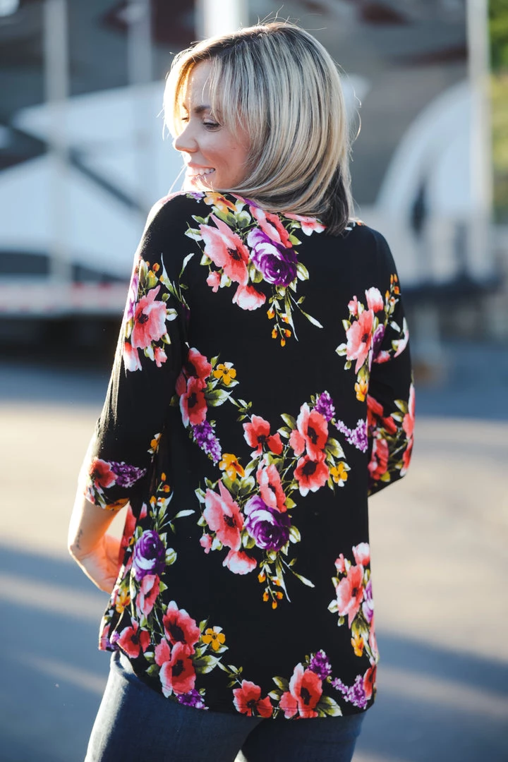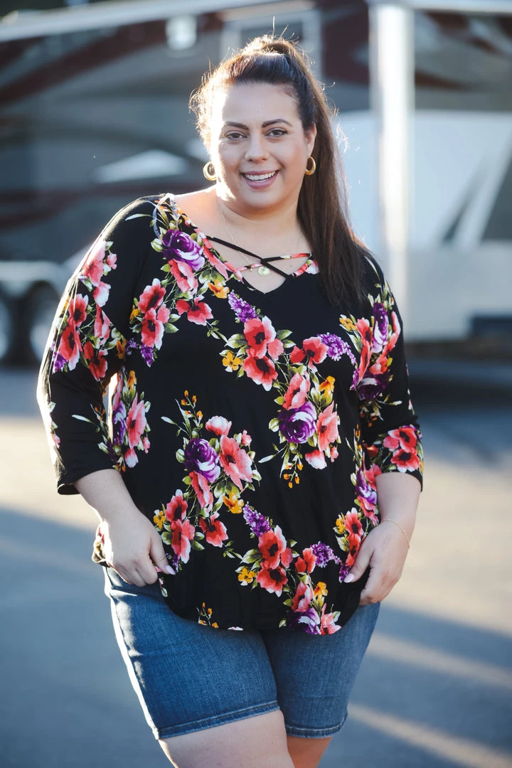 The colors of those flowers on this black top are so vibrant that it makes our heart skip a beat with love and joy. Made from the softest jersey fabric, this top features a v-neck with criss cross detail, 3/4 sleeves and rounded hem.Β Β