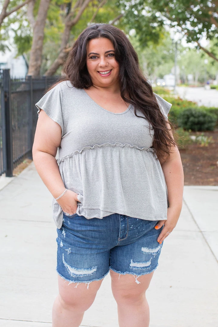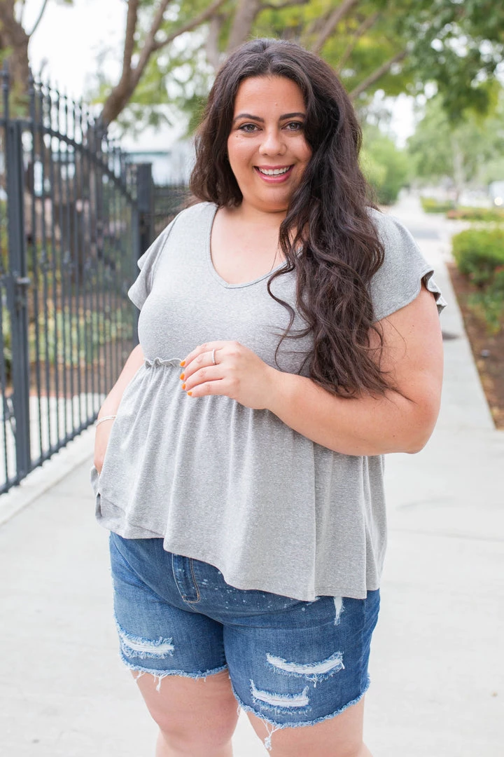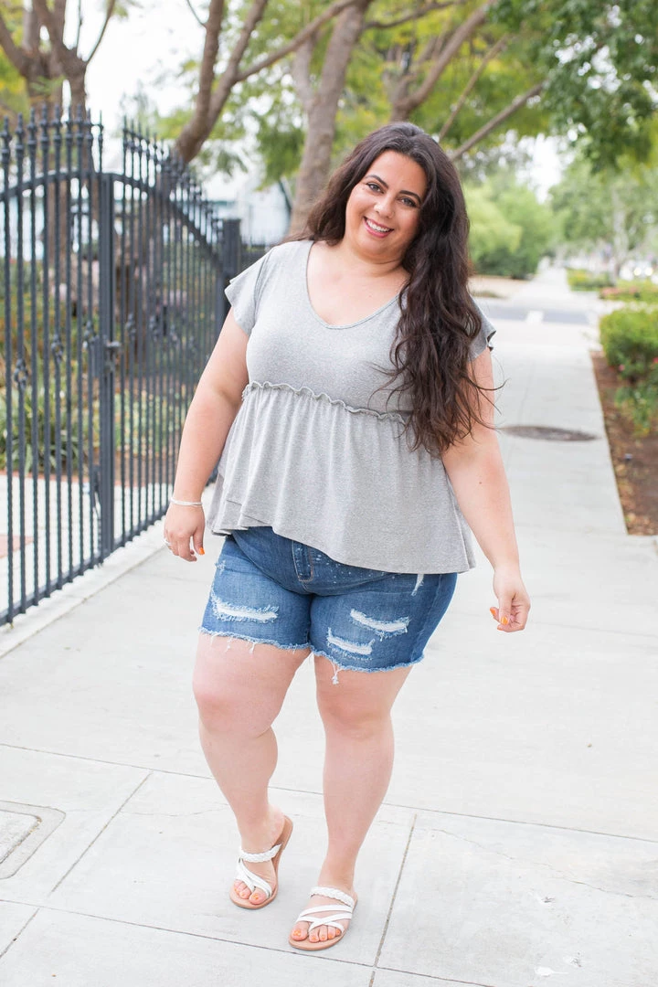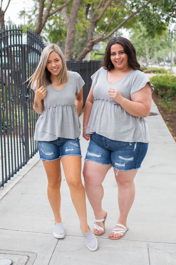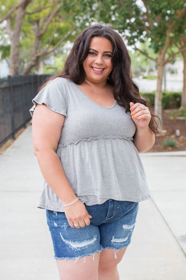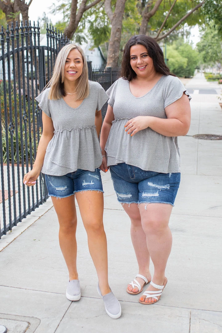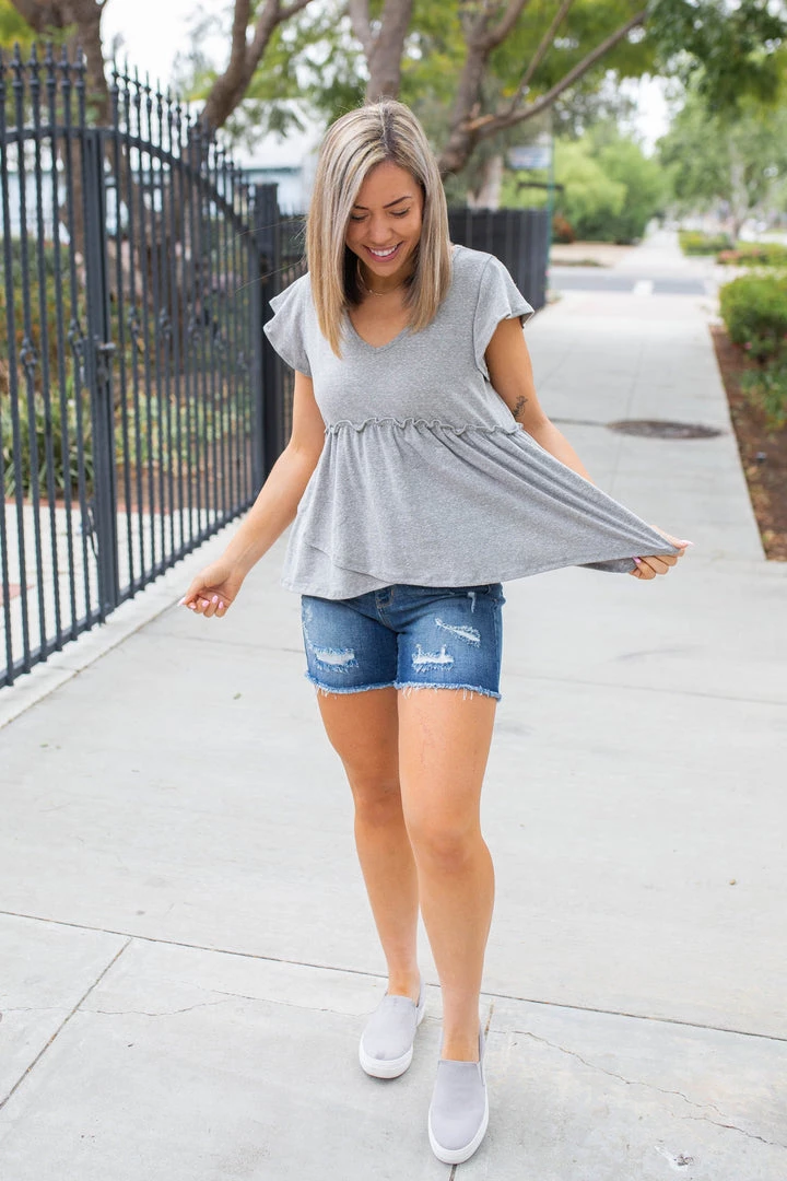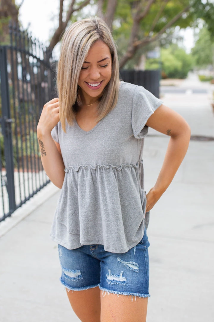 This ruffled peplum top has that yummy vintage tee-shirt feel. With a relaxed fit, thisΒ top features a round neckline,Β short sleeves and tiered ruffle hem.Β Β