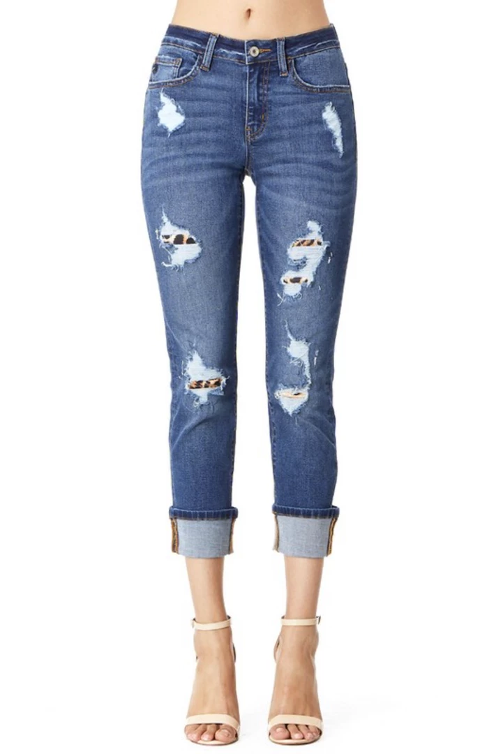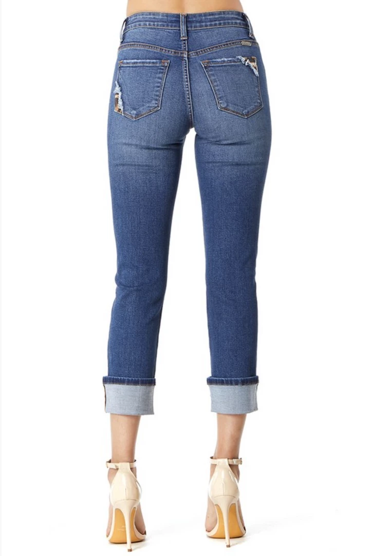 These lightly distressed with leopard patches, medium wash capri’s with rolled hem detail will be your “go-to” pants for those warmer days. A standard zip fly, single button closure and front and back pockets make these skinny capri’s a basic staple for every wardrobe.