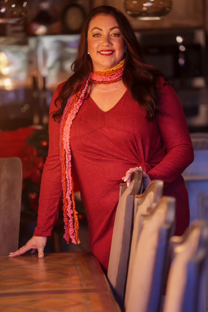 Wine & dine in style and comfort in this stunning burgundy sweater dress! Featuring long sleeves, v-neck and pleated, ruffled hem this dress will be great for any occasion that you have coming up.