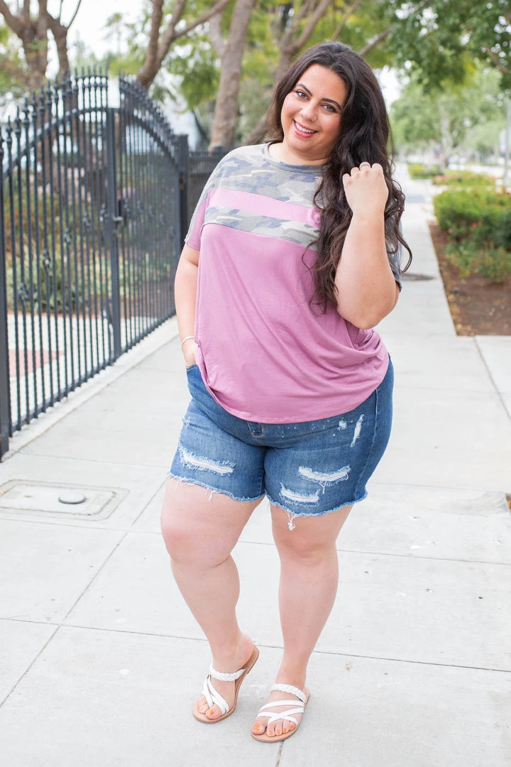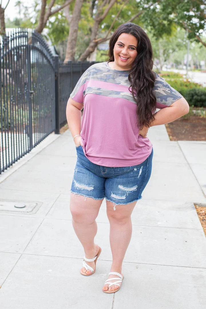 We are loving this mauve and camo colorblock top. With a relaxed fit, this top features a round neckline and short sleeves.