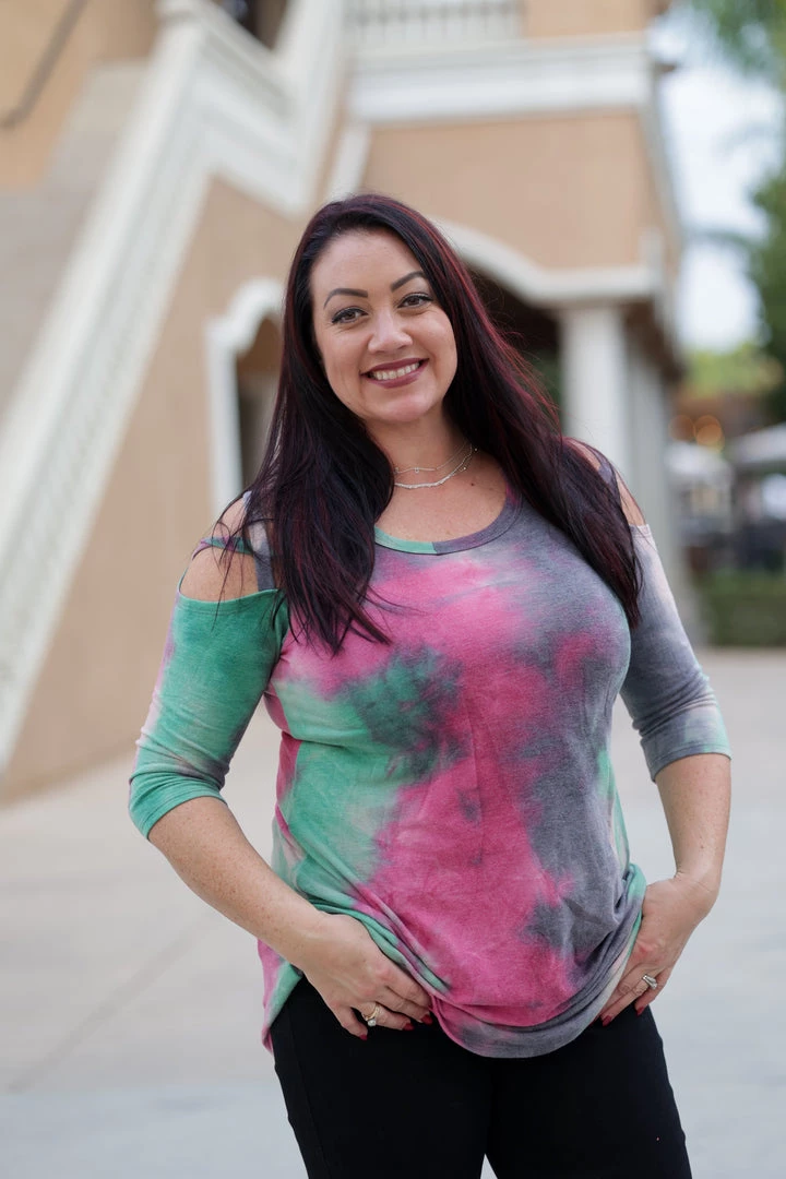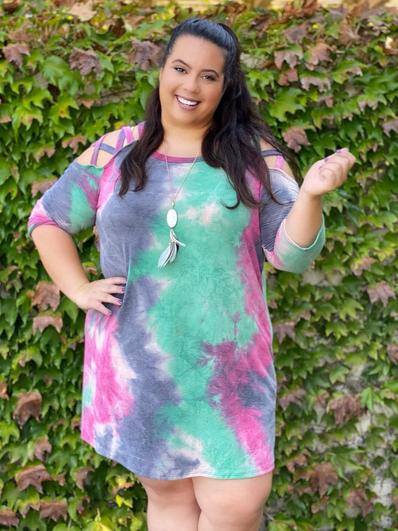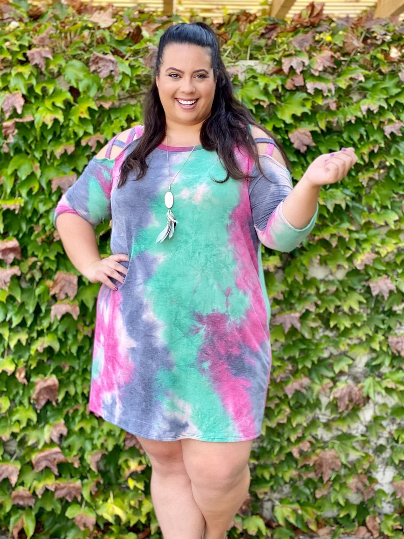 This tie dye cold shoulder dress is perfect for fall. The strappy cold shoulders really give this piece a unique a look. With a relaxed fit and 3/4 sleeves, this dress will look amazing with boots.Β Β