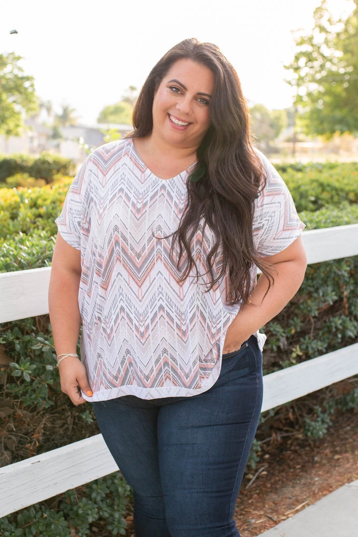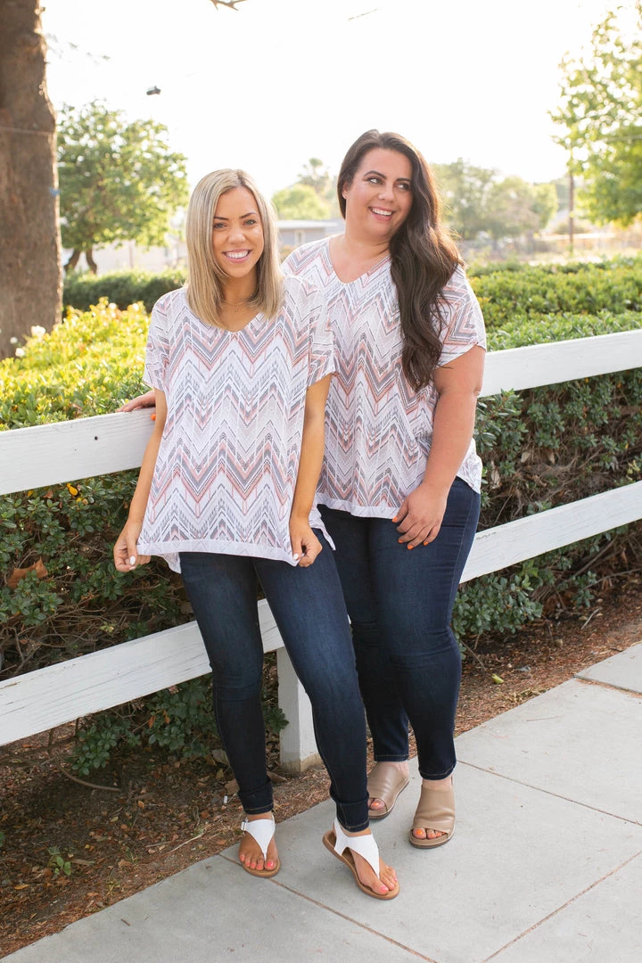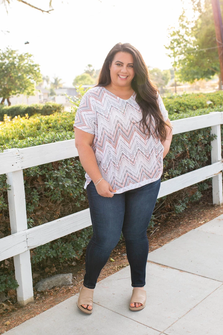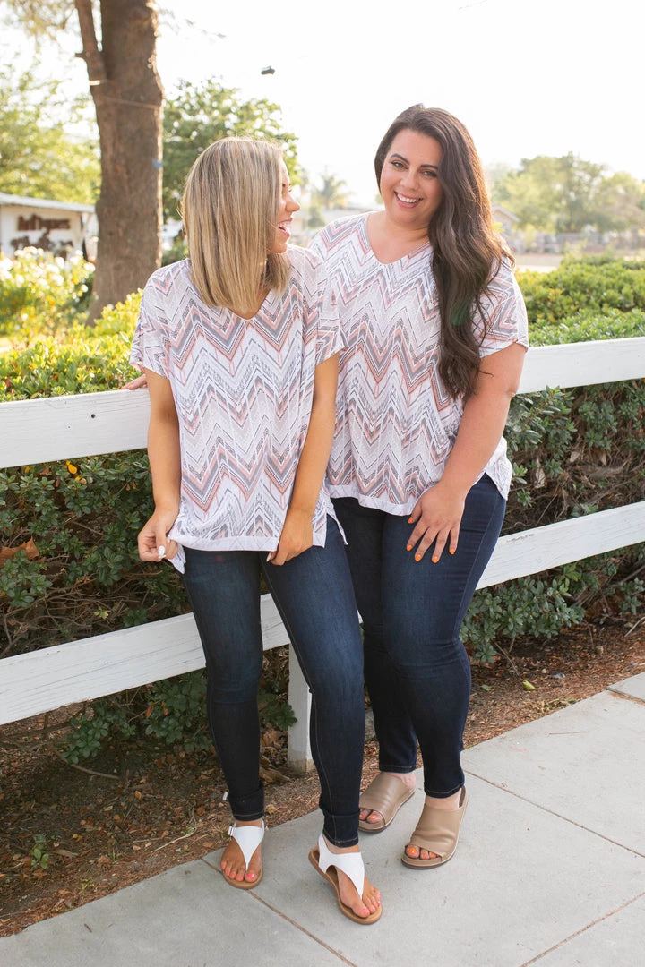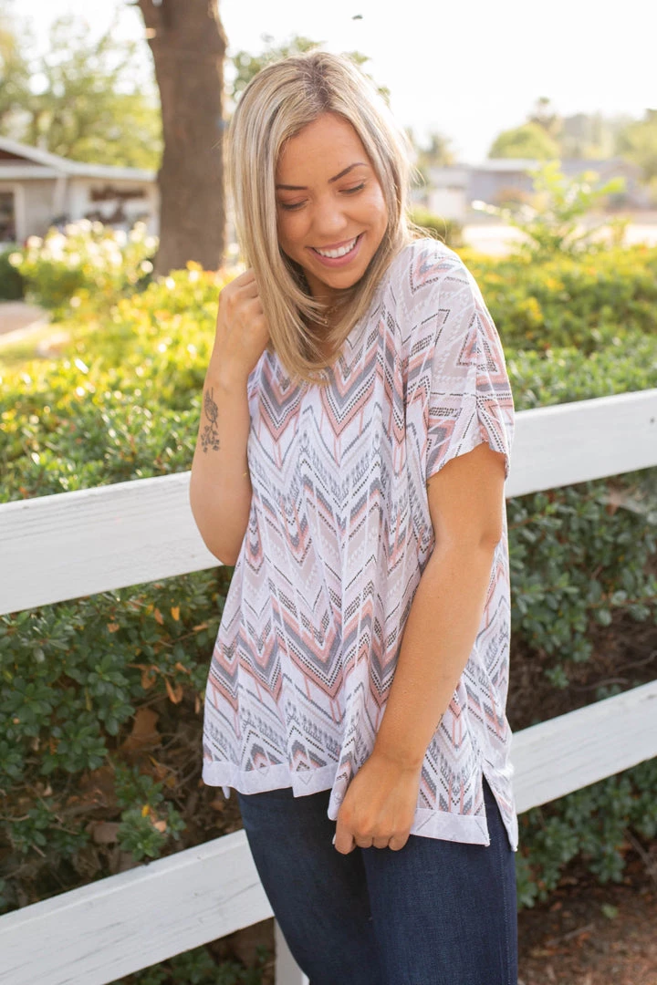 The perfect color combo! Greys and pinks! This short sleeve top features an oversized, relaxed fit, v-neck and curved hem with side slit detail.Β Β Β
