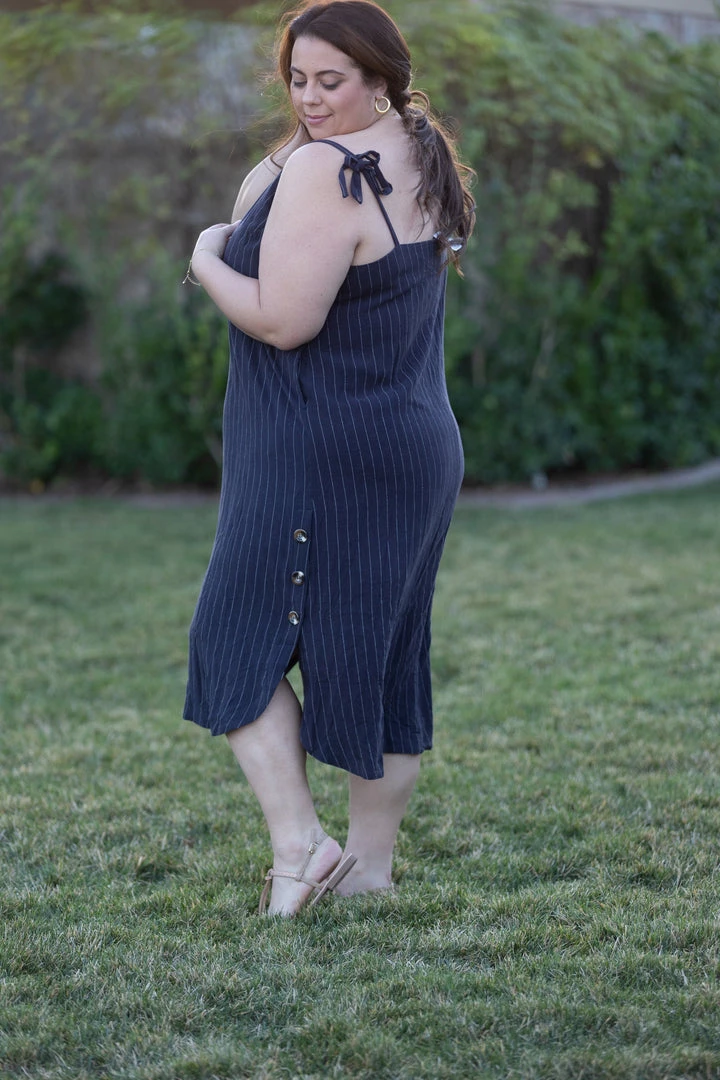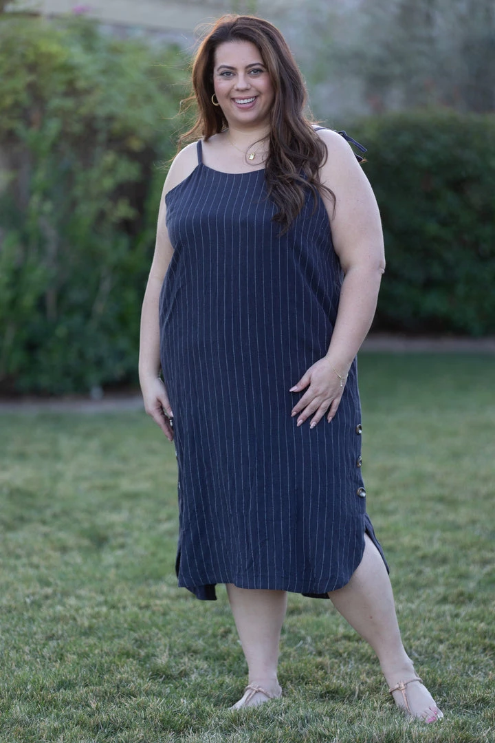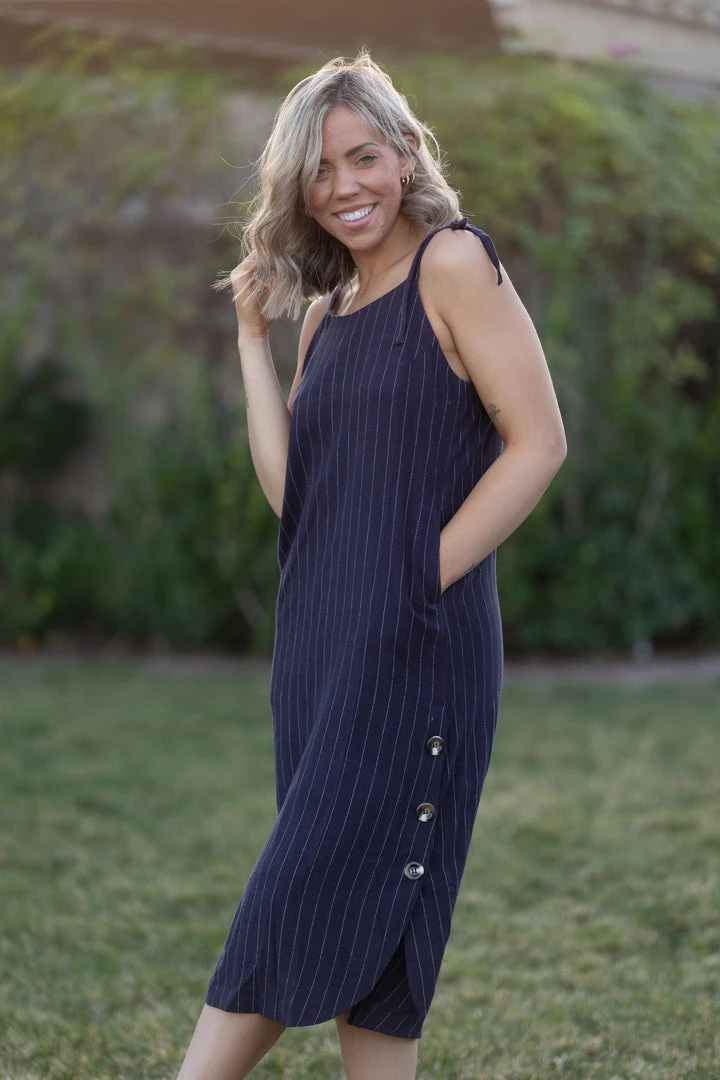 This navy pin striped woven dress has us spinning with happiness. With relaxed fit, this dress features a square neckline, adjustable self tie straps and a curved hem with button details.