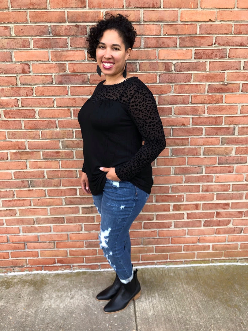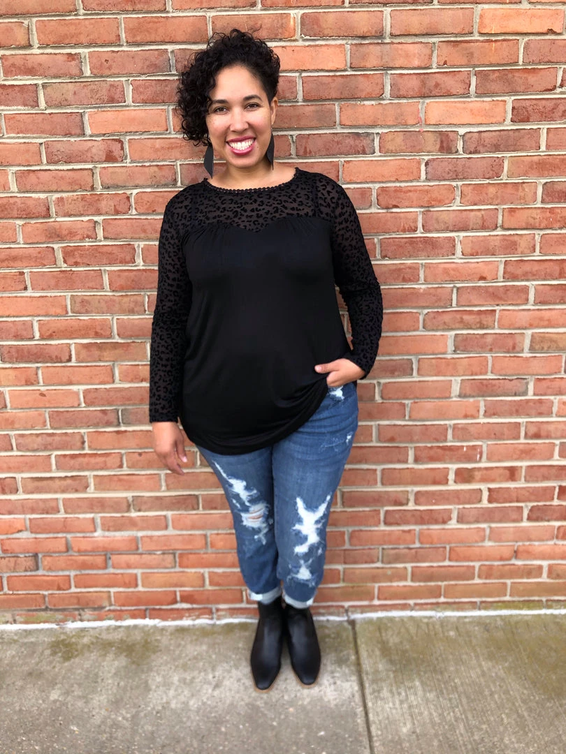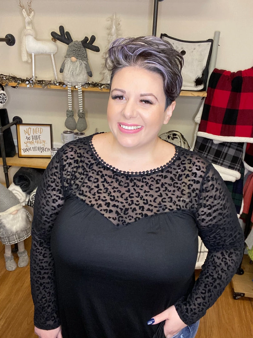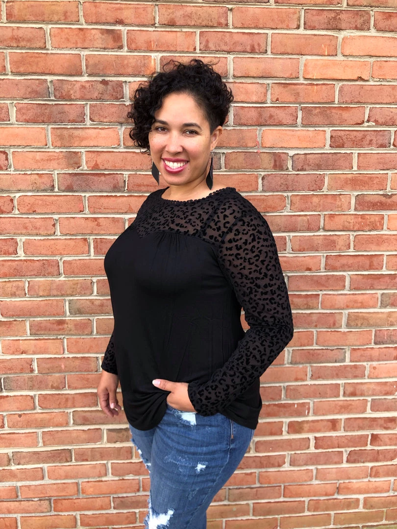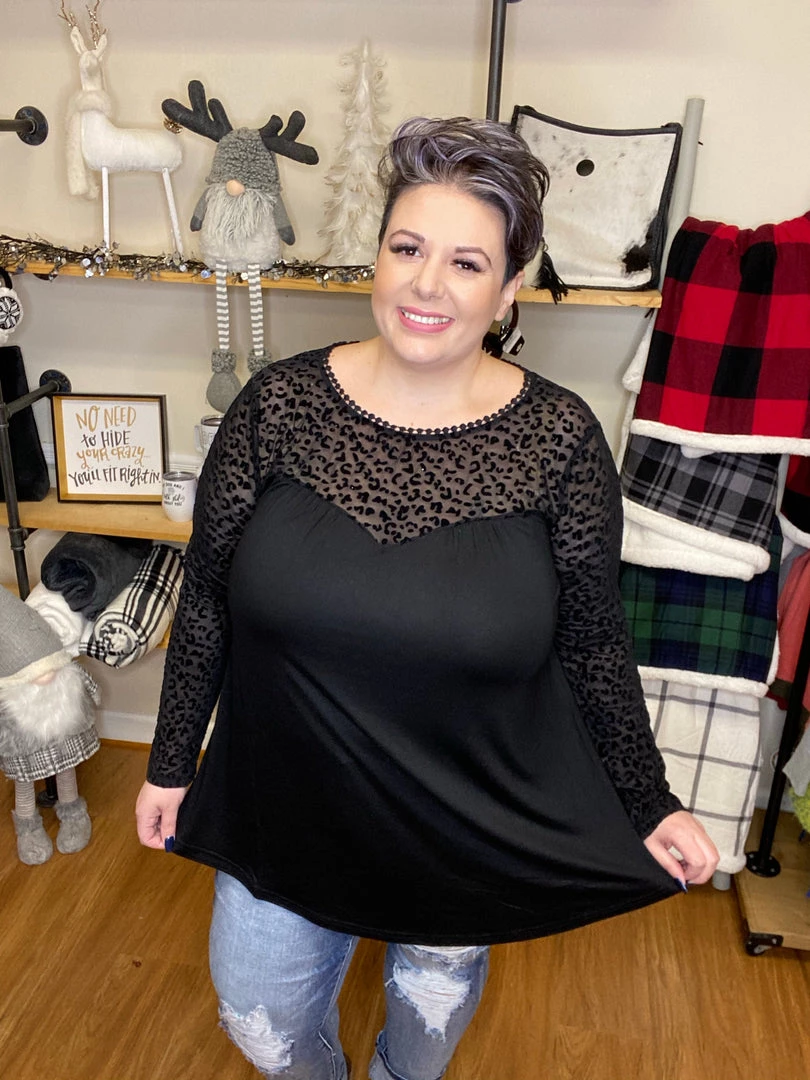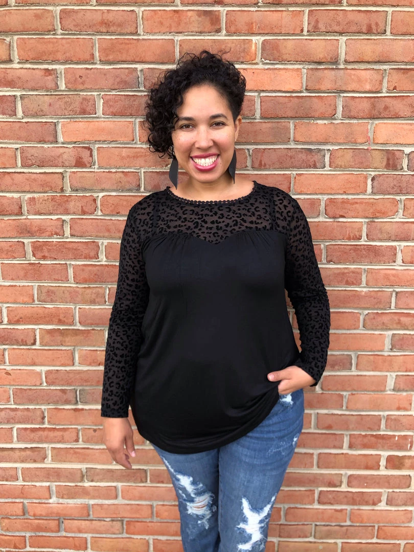 Solid Jersey Long Sleeve Fashion Top with Velvet Animal Print Mesh Contrast and Lace Detail
