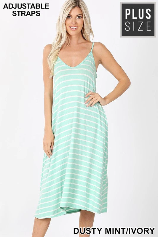V-NECK CAMI KNEE LENGTH STRIPE DRESS WITH ADJUSTABLE STRAP TOTAL BODY LENGTH (HIGH POINT BUST): 38.5" CHEST: 42" approx. - MEASURED FROM 1X