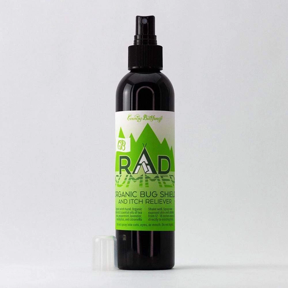 8ย oz. | Rad Summer organic bug shield uses organic castor oil and witch hazel, plus tea tree, peppermint, lavender, eucalyptus, and citronella essential oils to protect you from mosquitos and other pests. Spray on exposed skin and clothes to create a protective shield that keeps bugs off and games on.ย Our travel size fine mist bottle is sturdy and BPA free.