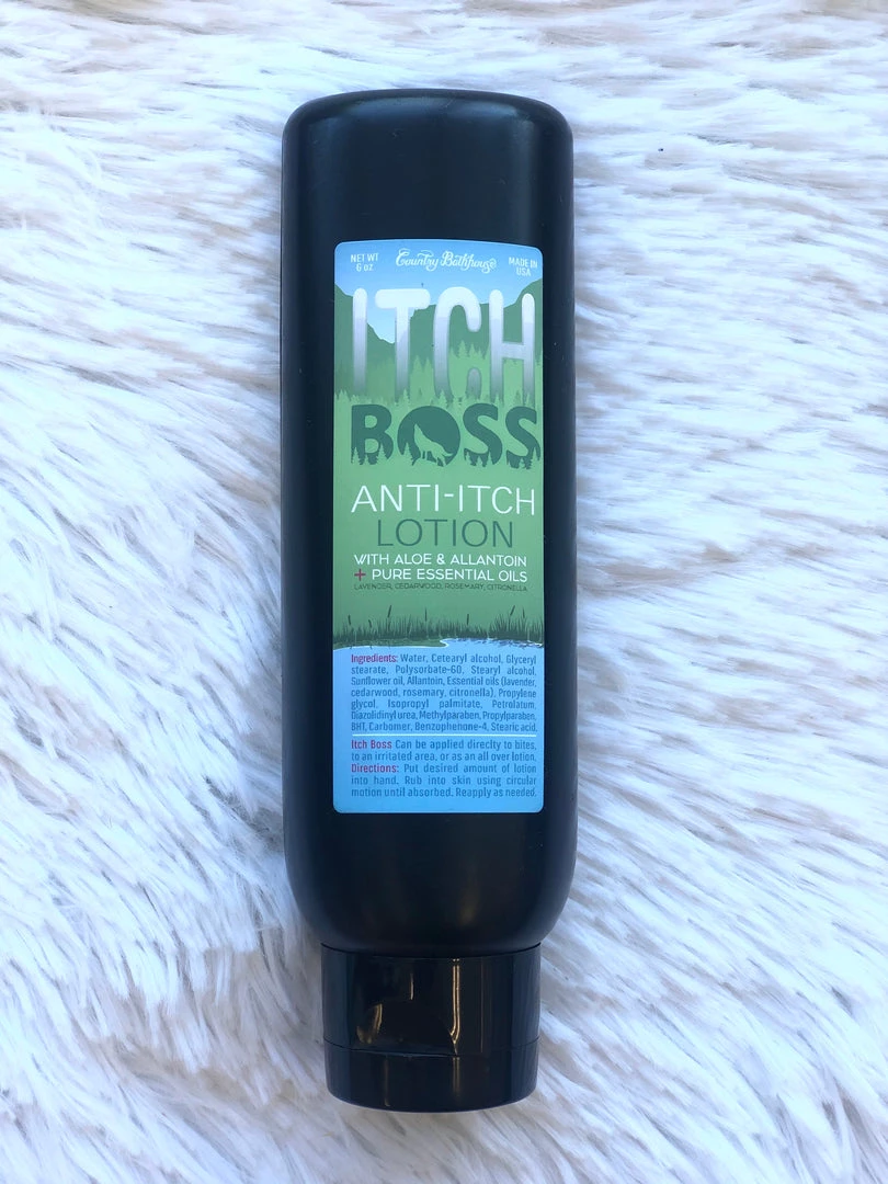 Itch Boss Anti Lotion is made with Aloe & Allantoin and Pure Essential Oils. (lavender, Cedar-wood, Rosemary, Citronella)